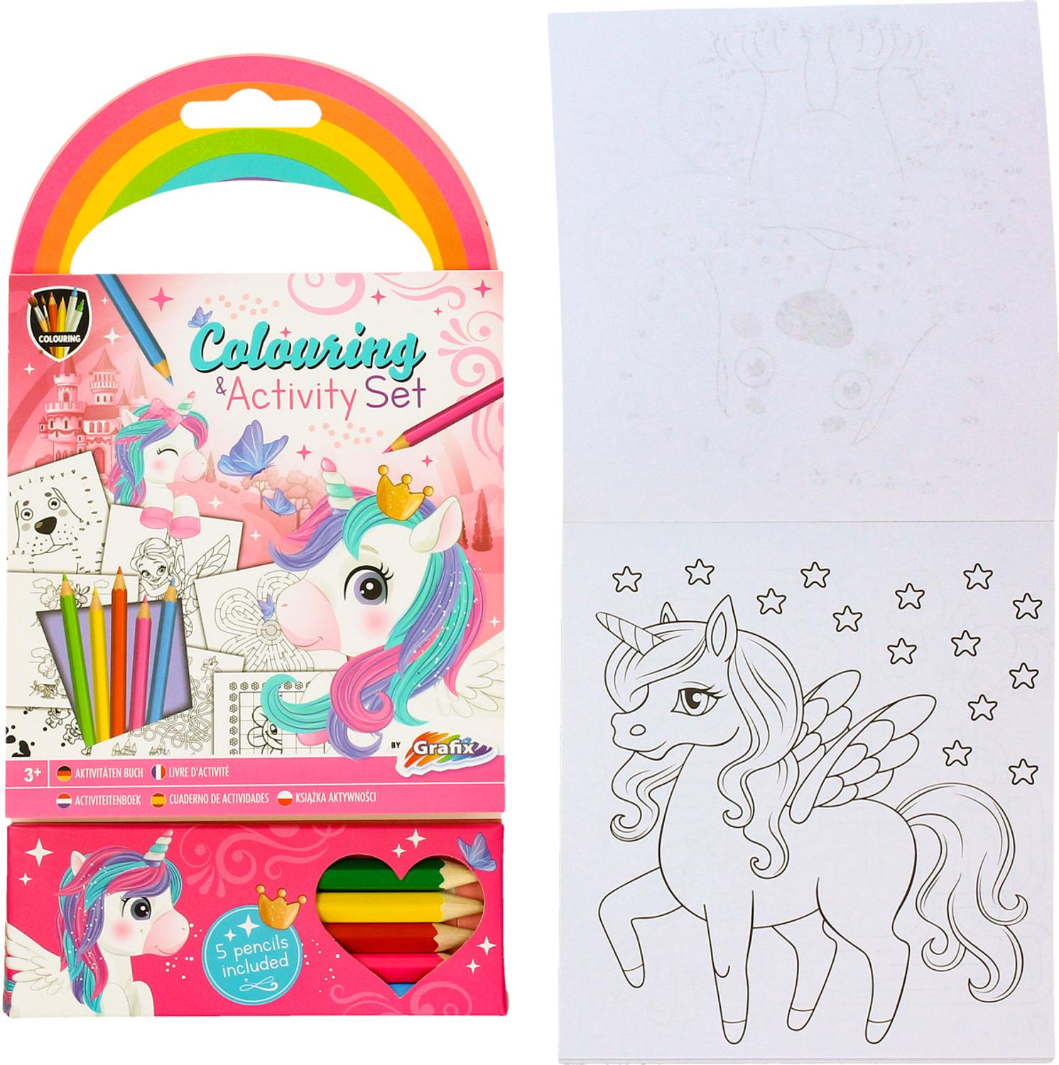 Dit leuke, creatieve pakket van Grafix bestaat uit 5 kleurpotloden en ca. 60 vellen met kleurplaten, puzzels, doolhoven, woordzoekers en andere activiteiten. Het pakket en de kleurplaten zijn vormgegeven in eenhoorn- en sprookjesthema.