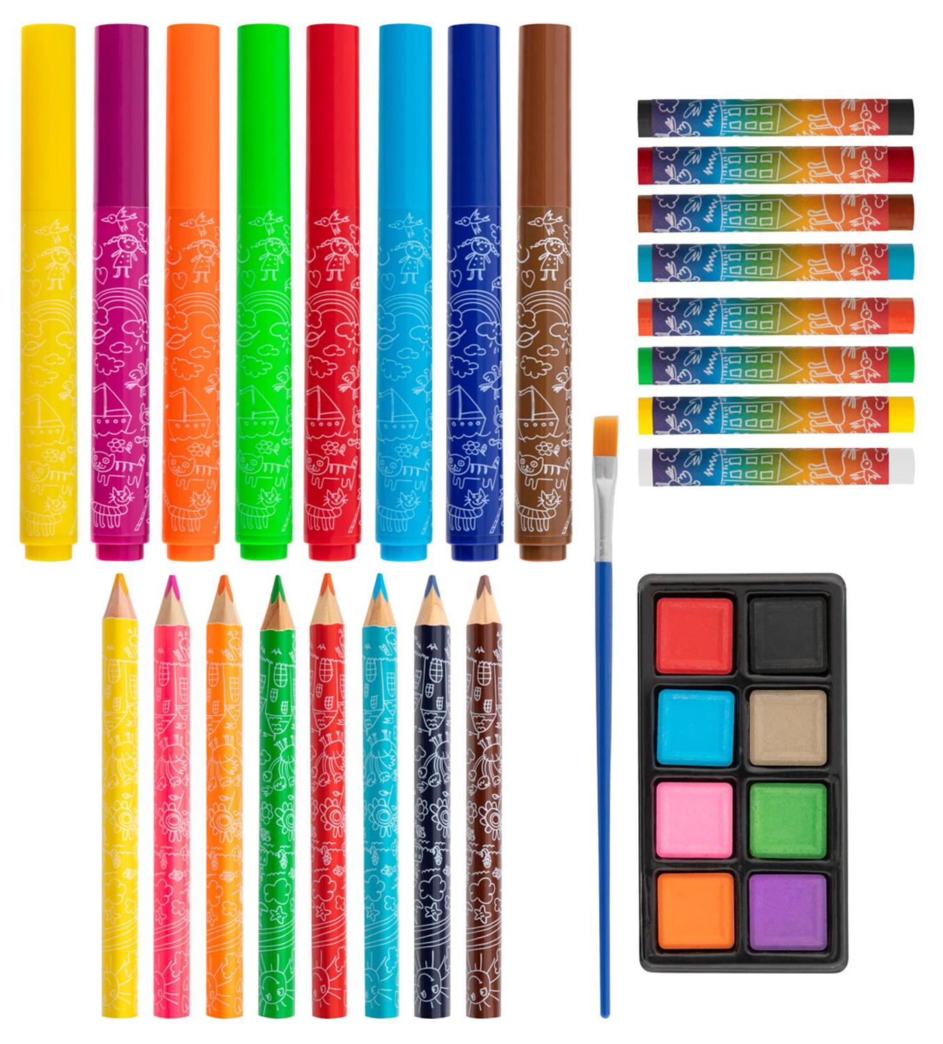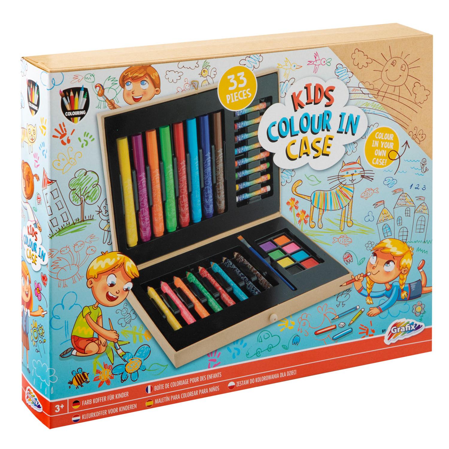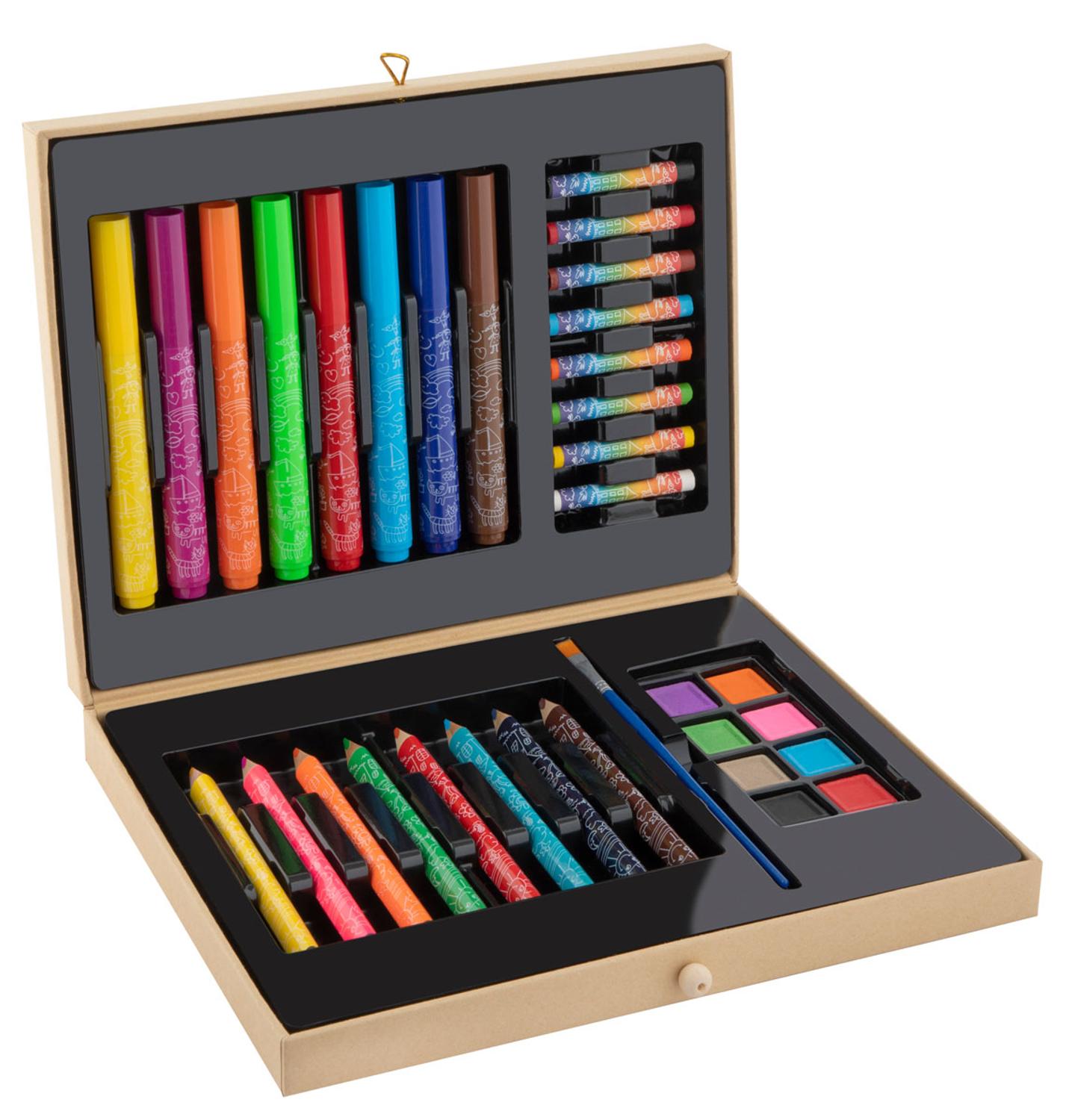 Deze houten kleurkoffer zit boordevol kleurmaterialen! Of je nu aan de slag wilt met een kunstwerk met krijtjes, potloden, stiften of waterverf, het kan allemaal!