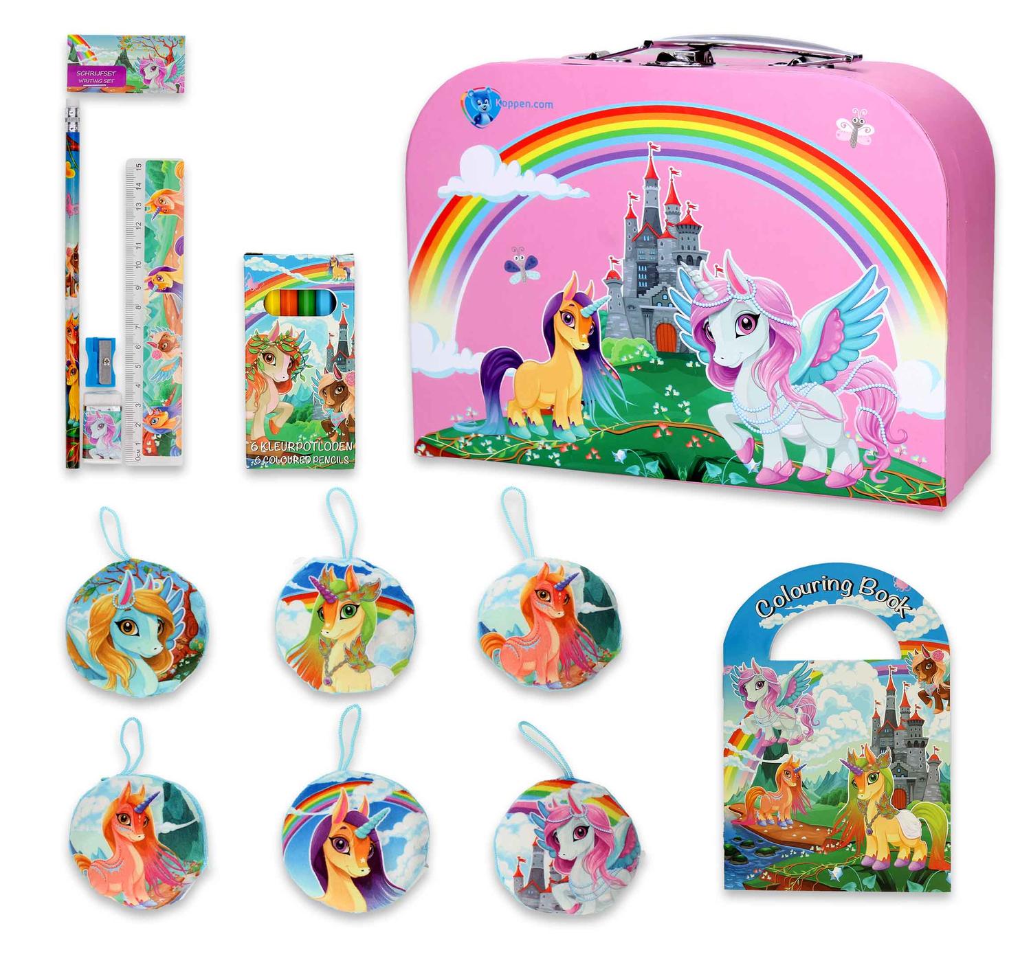 Koffer eenhoorn met inhoud is een kleurrijke speelset in een vrolijke koffer met eenhoornthema. De set bevat: