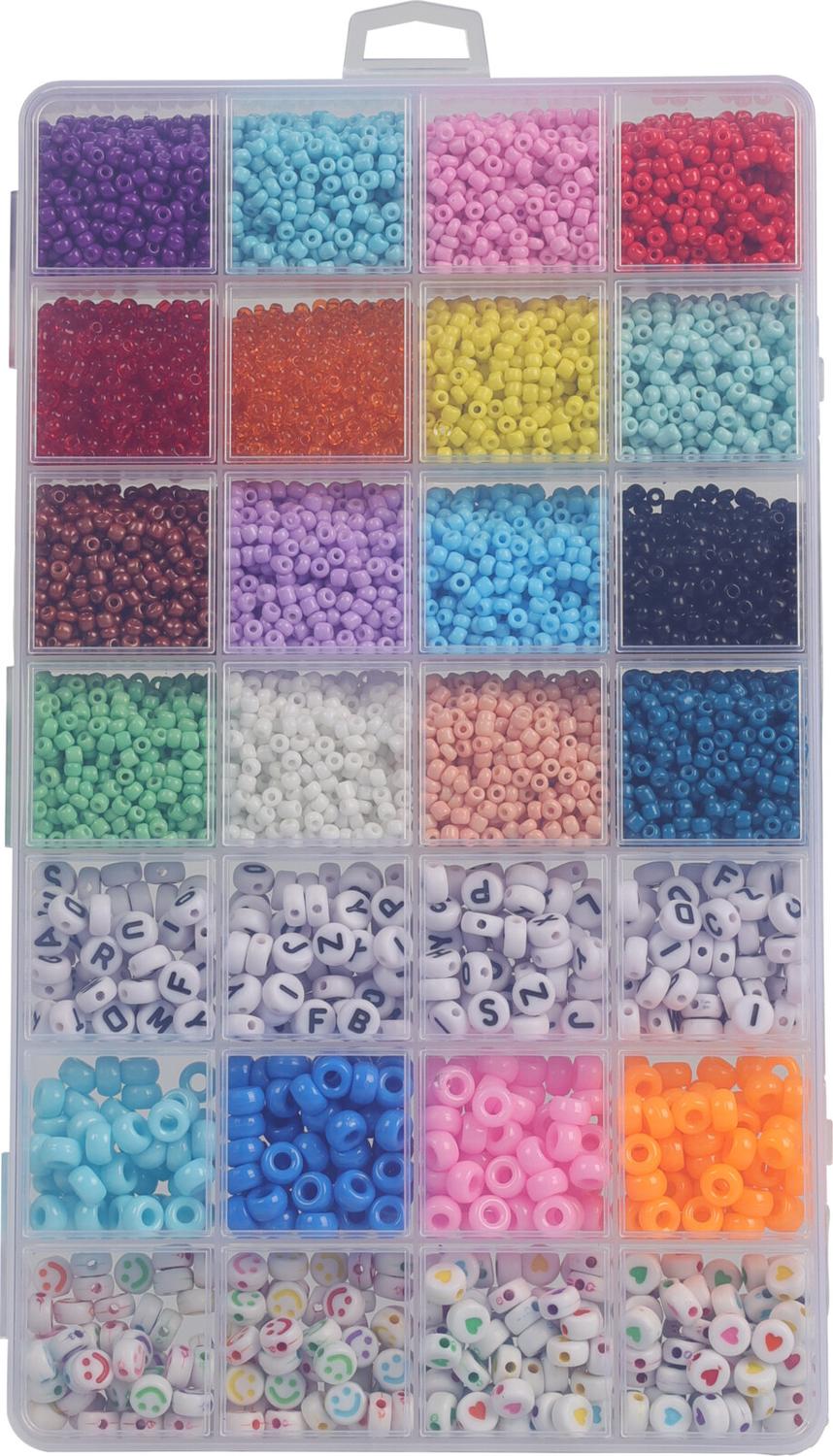 Kunststof opbergdoos met 28 verschillende soorten kraaltjes. O.a. letterkralen, smileykralen en gekleurde kralen in verschillende formaten.