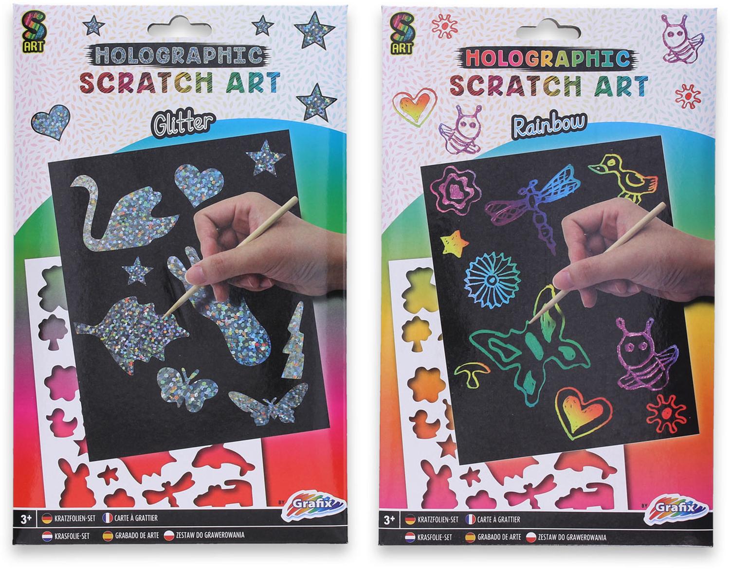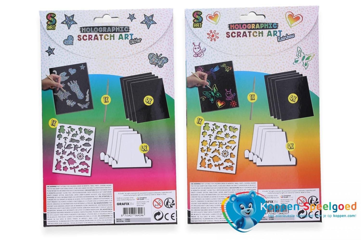 Krasvel met regenboog- of glitterachtergrond: kras over de vellen en er ontstaan de mooiste kleuren. Iedere set bevat 4 krasvellen, sjablonen en een kraspen.