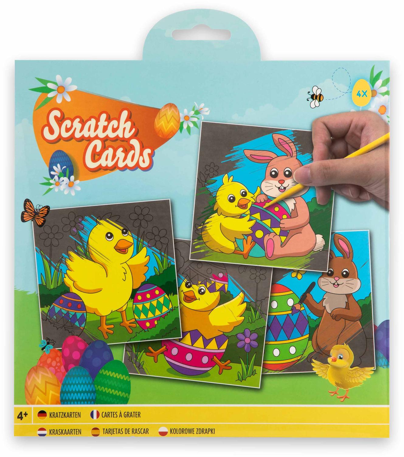 Setje met 4 kraskaarten in Paasthema. Gebruik het bijgevoegde houten pennetje om de tekeningen tevoorschijn te toveren!