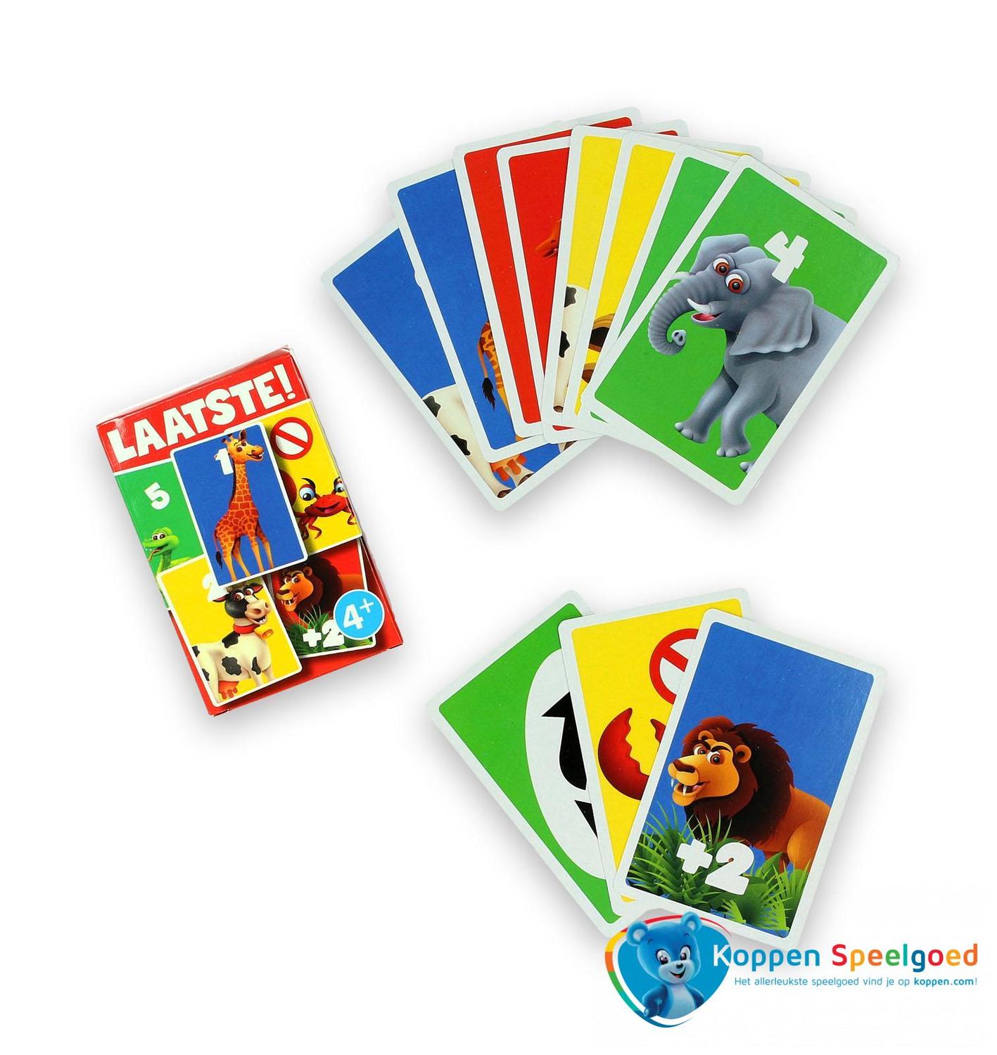 Laatste! spel. Deel de kaarten uit en zorg dat jij als eerste alle kaartjes kwijt bent. Heb je nog één kaartje over? Roep dan snel 'laatste!', voordat je extra kaartjes bij moet pakken. De kaartjes hebben plaatjes van vrolijke dieren. Geschikt voor kinderen vanaf vier jaar. Het is een sport en spel om je vriendjes te verslaan! Compact van formaat, dus makkelijk mee te nemen in je binnenzak.