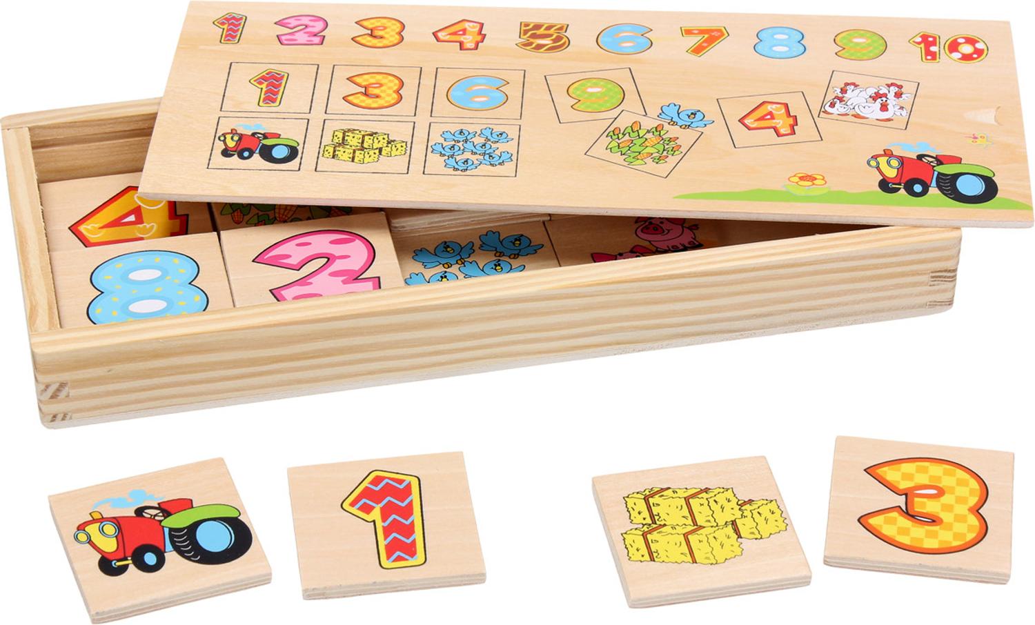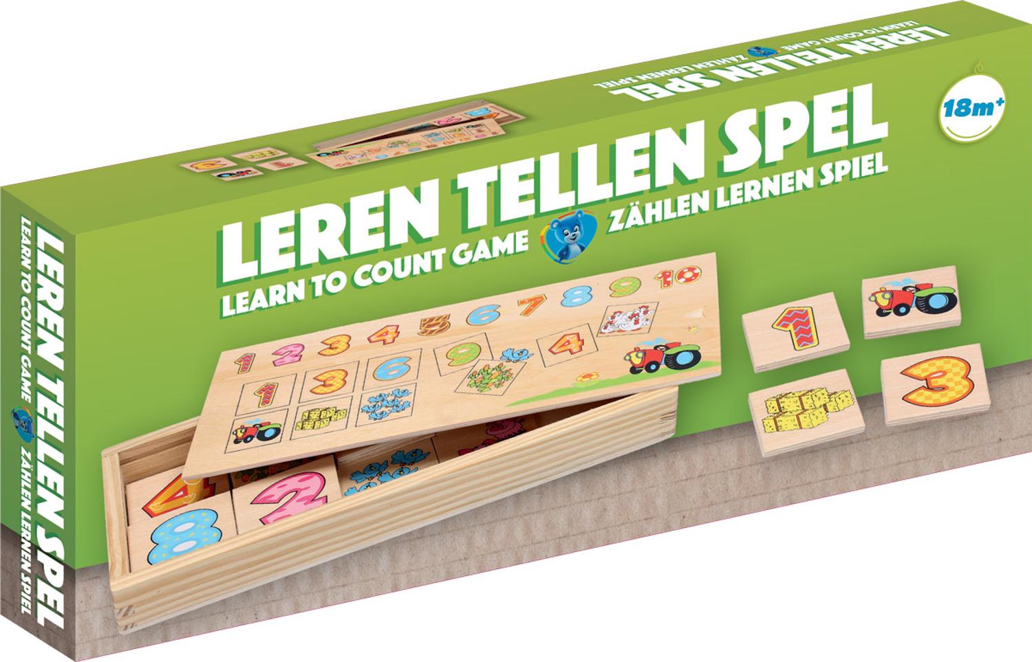 Met deze leuke set leren kinderen tellen. Het thema is boerderij. De kleuren en design van de getallen komen overeen met de kleuren van het bijpassende plankje. Op dit plankje staat bijvoorbeeld 1 tractor en die past dan bij nummer 1. Dit houten speelgoed is geschikt voor kinderen vanaf 18 maanden.