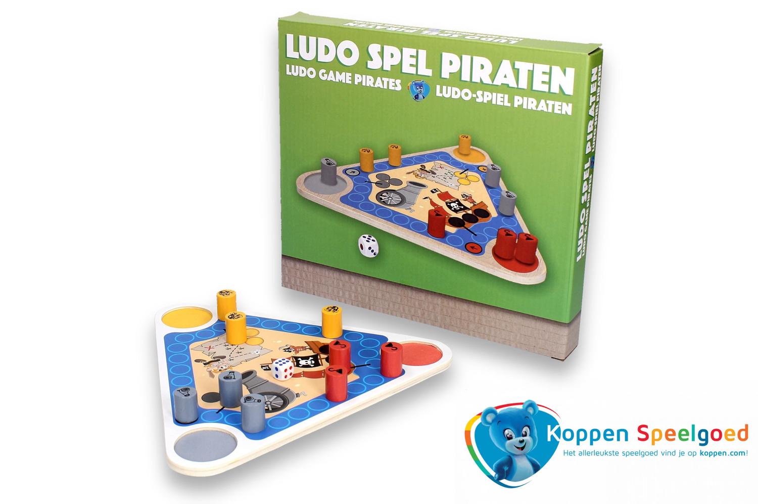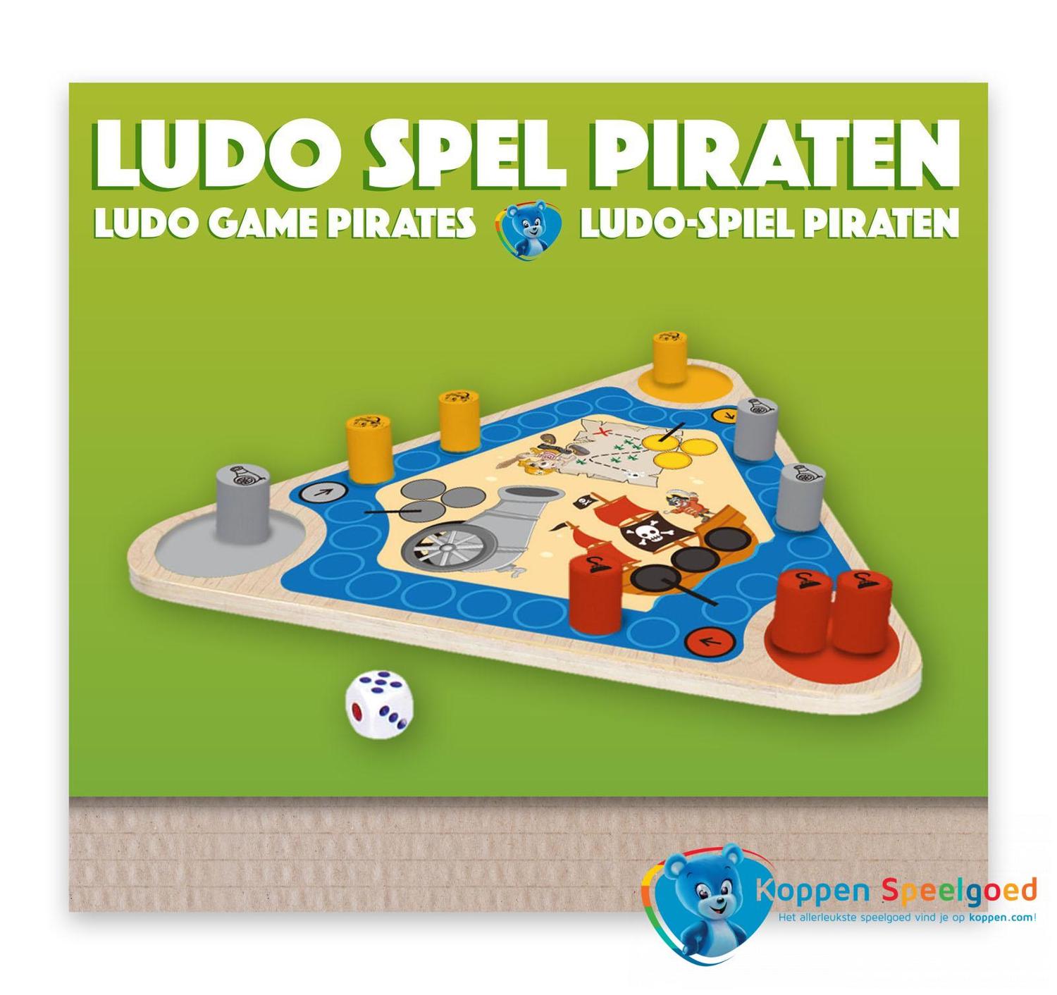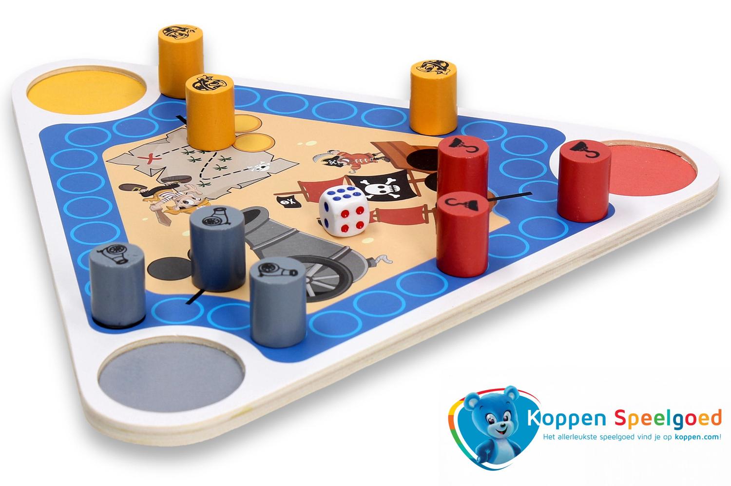 Ludo spel piraat. Een ludo-spel in piratenthema. Het spel is van hout. Geschikt voor drie spelers. Gooi de dobbelsteen en probeer alle drie de speelstukken in jouw kleur op het schip, op het kanon of op de landkaart te krijgen. Geschikt voor kinderen vanaf drie jaar.