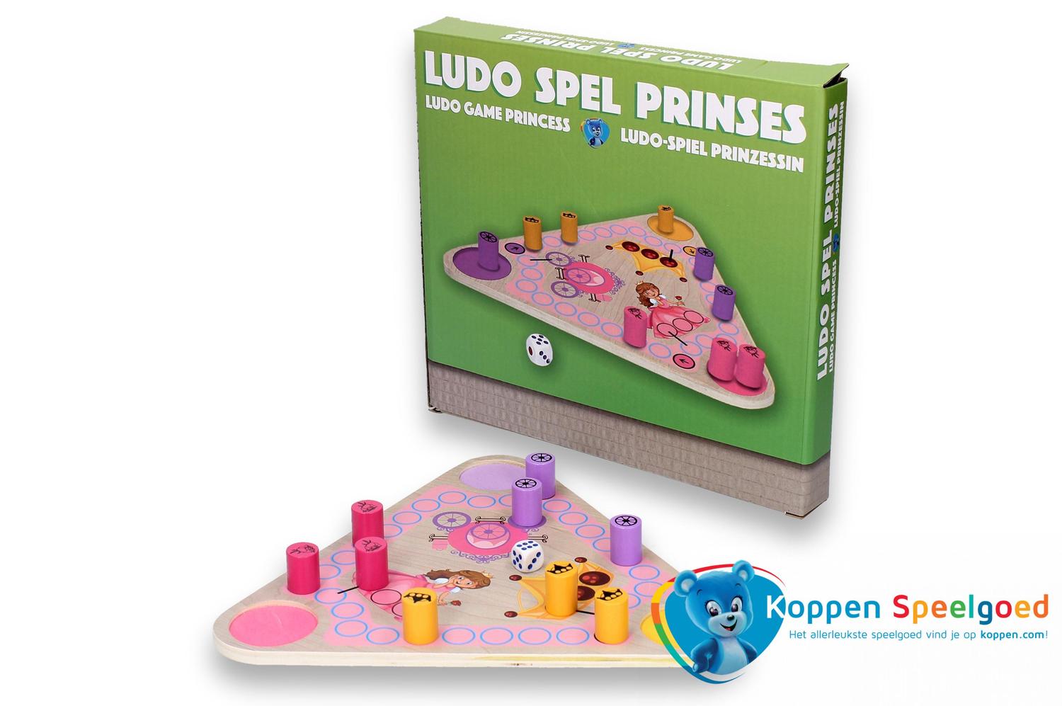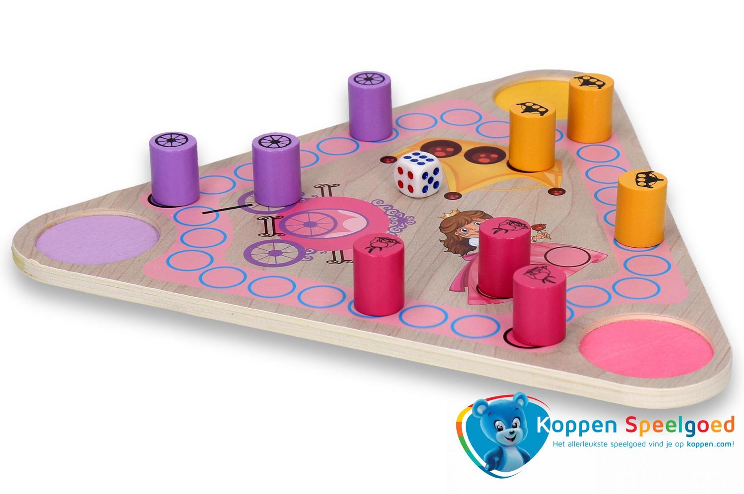 Ludo spel prinses. Een ludo-spel in prinsessenthema. Het spel is van hout. Gooi de dobbelsteen en probeer alle drie de prinsessen van jouw kleur op de koets, het kroontje of de roze baljurk te krijgen. Geschikt voor kinderen vanaf drie jaar.