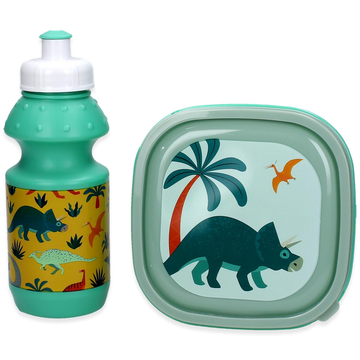 De set bestaat uit een handige tas, een drinkbeker én een broodtrommel met dino-print.