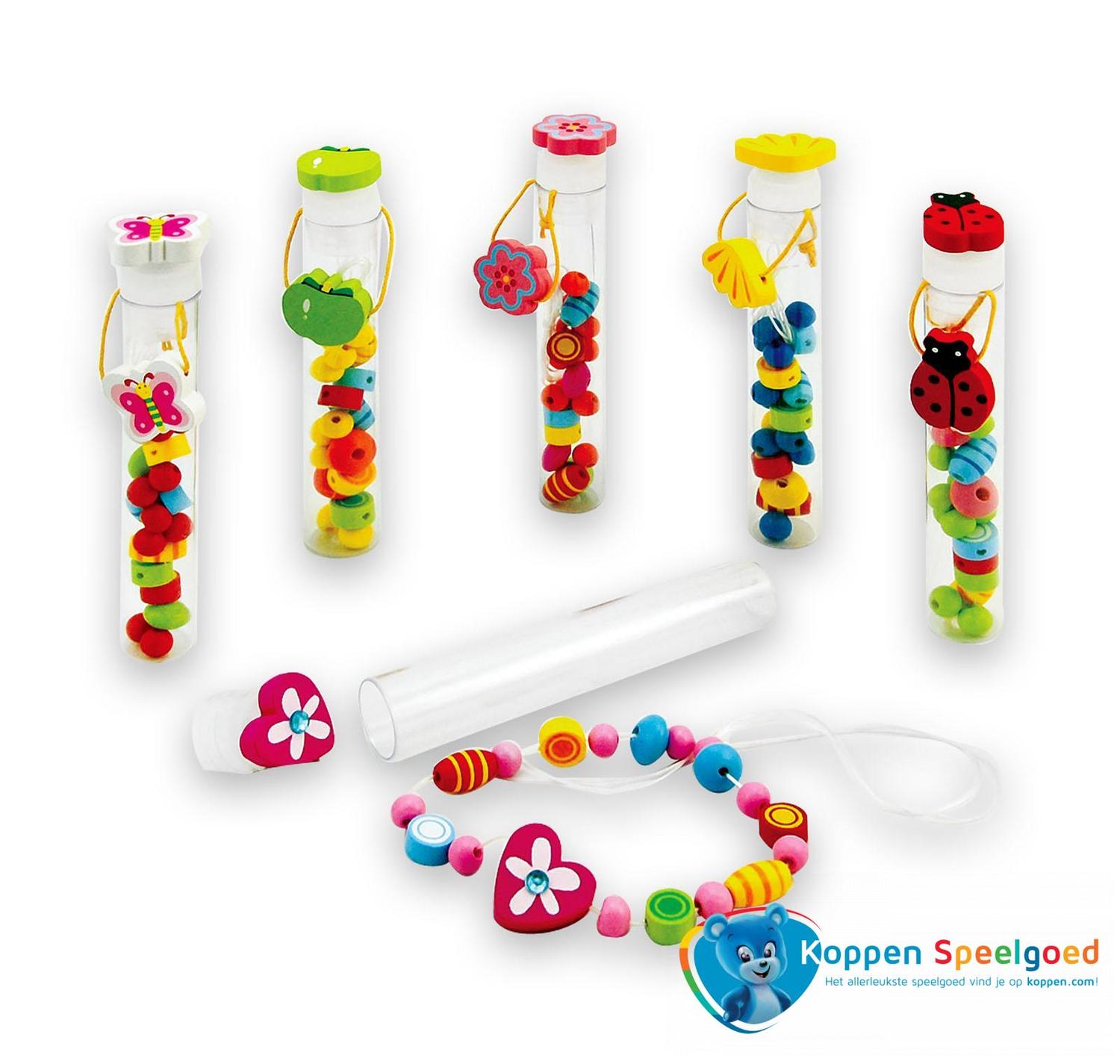 Maak je eigen houten halsketting. In de koker zitten verschillende versiering die je op je eigen manier aan je ketting kan rijgen. De halskettingen worden door elkaar geleverd. Dit houten speelgoed is geschikt voor kinderen vanaf drie jaar.