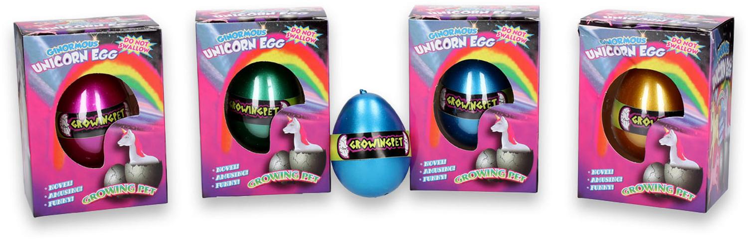 Magische groei eenhoorn in ei. Doe het ei in het water. Na 24 tot 48 uur komt het ei uit. De volgende 24 uur groeit de eenhoorn. Na 72 uur is het ei weg en is de eenhoorn volledig gegroeid. Geschikt voor kinderen vanaf drie jaar.
