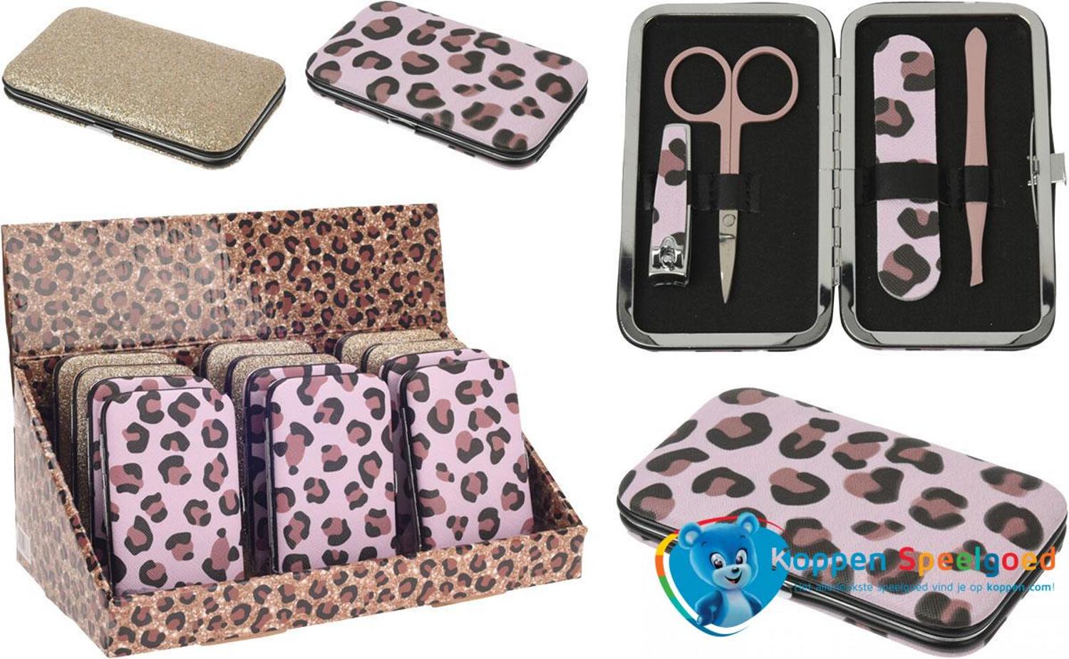 Manicureset panterdesign. Inhoud : schaartje, pinset, nagelknipper en vijl. Worden door elkaar geleverd. Prijs per set.