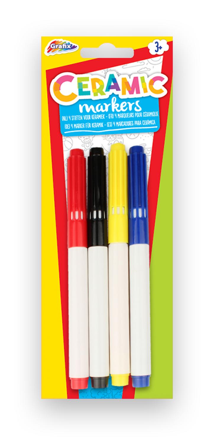 Markeerstiften. Vier stiften voor keramiek. Op de kaart zitten de kleuren geel, rood, blauw en zwart. Geschikt voor kinderen vanaf drie jaar.