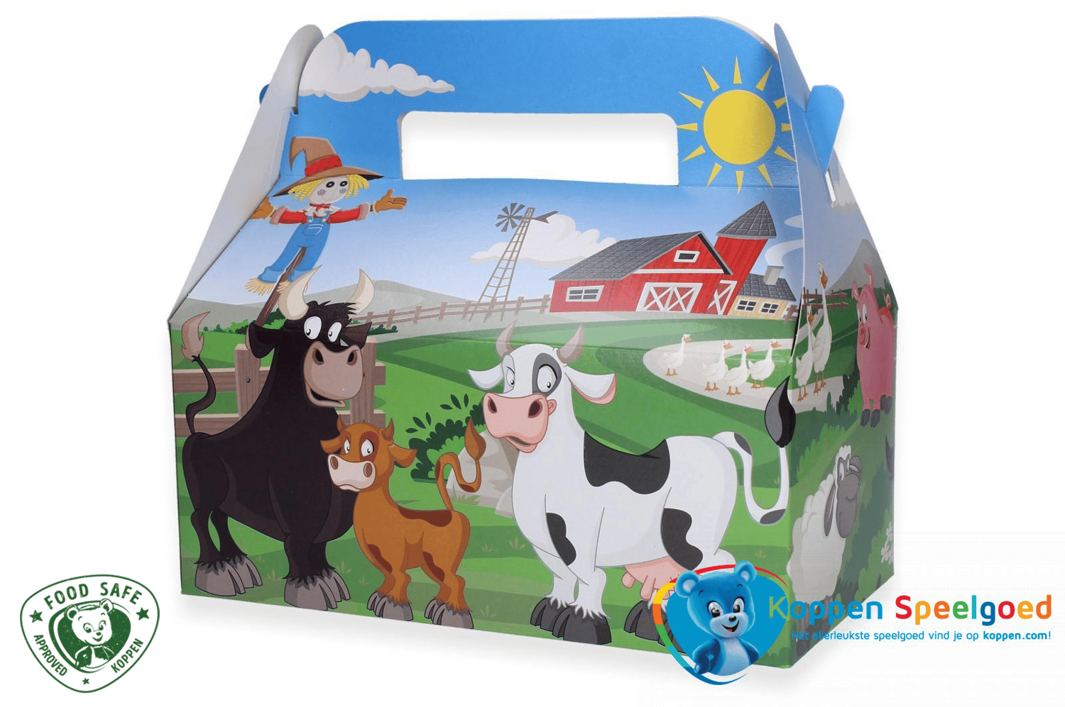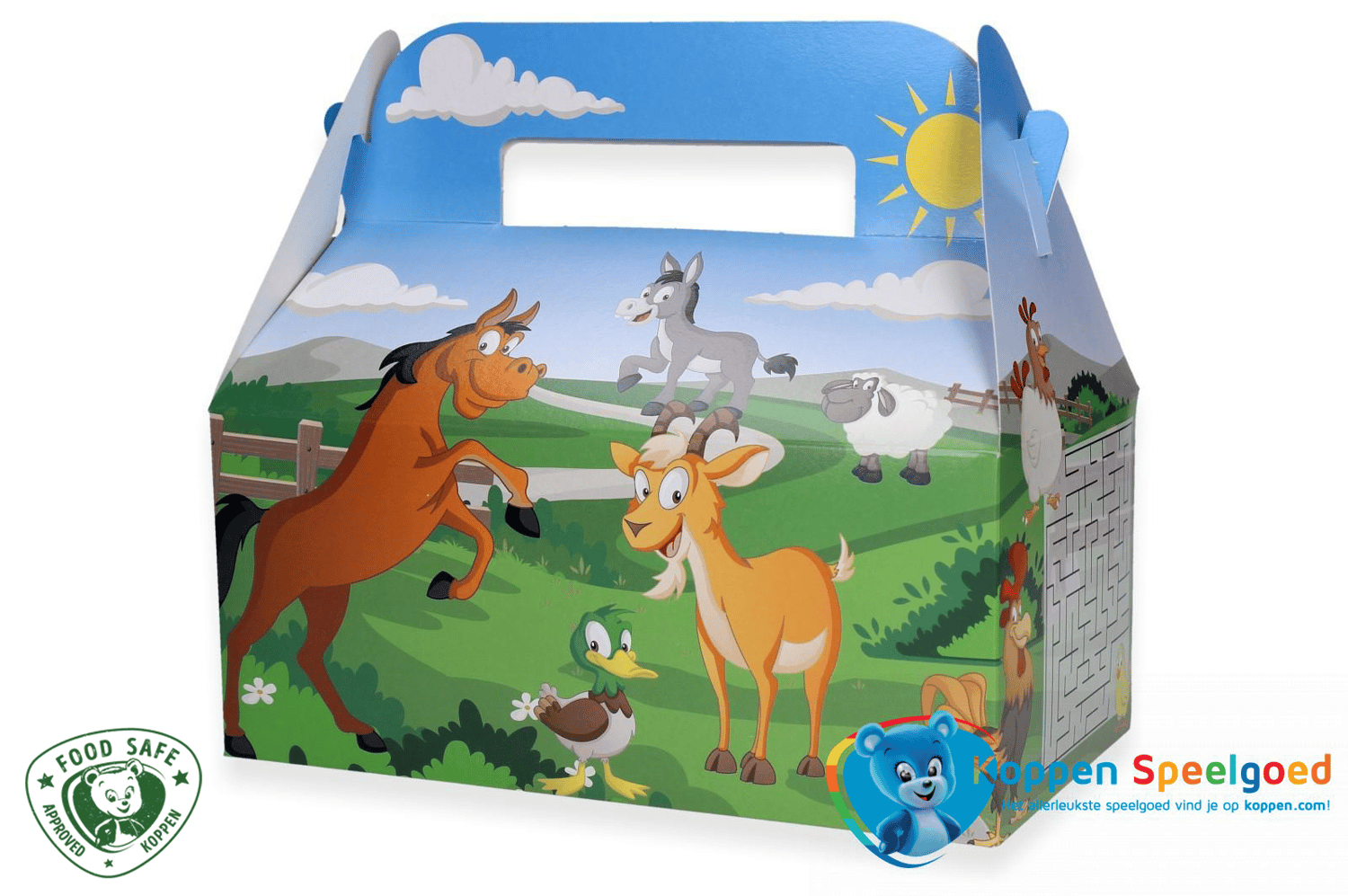 De menubox Boerderij is een kleurrijke en stevige foodbox met een gellig boerderijthema. De box is gemaakt van food safe karton en voorzien van een praktisch handvat, ideaal voor kindermaaltijden in restaurants, cafetaria’s, speelparken en andere horecagelegenheden.