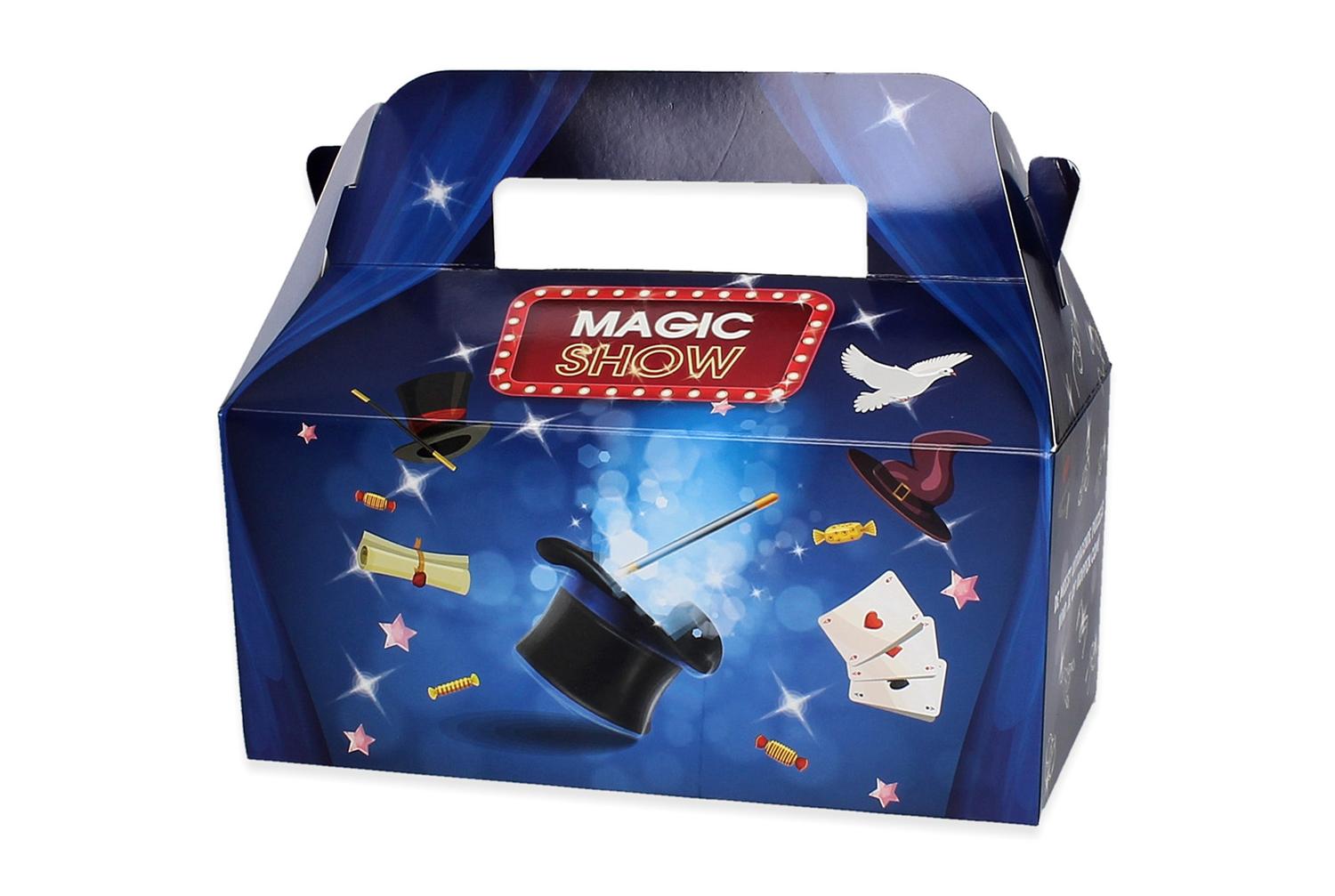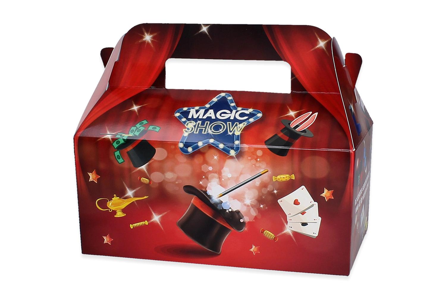 De menubox magic is een kleurrijke en stevige foodbox met een magiethema. De box is gemaakt van food safe karton en voorzien van een praktisch handvat, ideaal voor kindermaaltijden in restaurants, cafetaria’s, speelparken en andere horecagelegenheden.