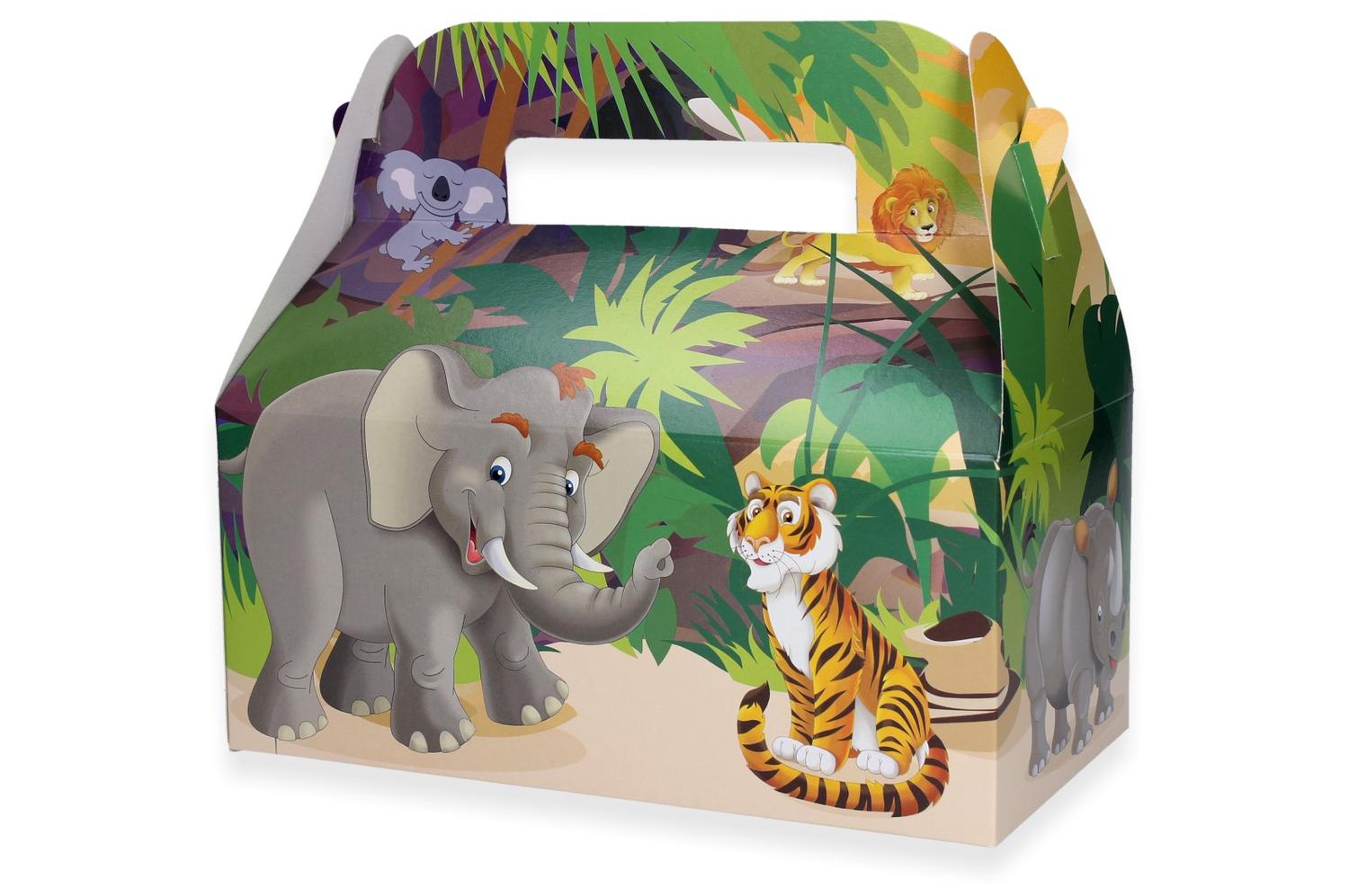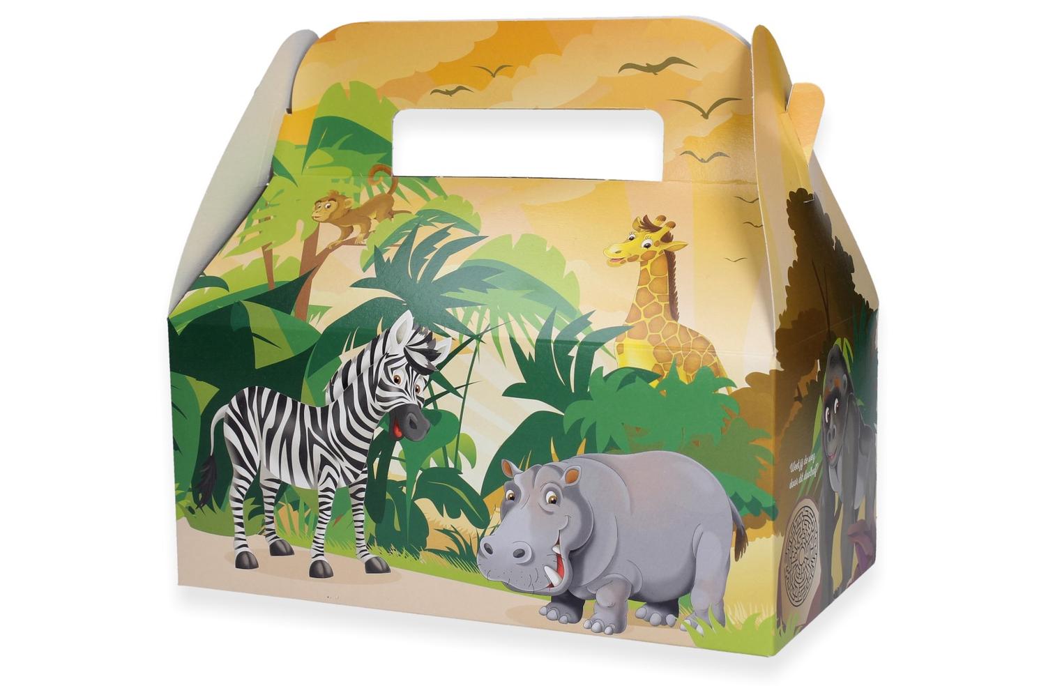 De menubox wilde dieren is een kleurrijke en stevige foodbox met een speels Jungle thema. De box is gemaakt van food safe karton en voorzien van een praktisch handvat, ideaal voor kindermaaltijden in restaurants, cafetaria’s, speelparken en andere horecagelegenheden.