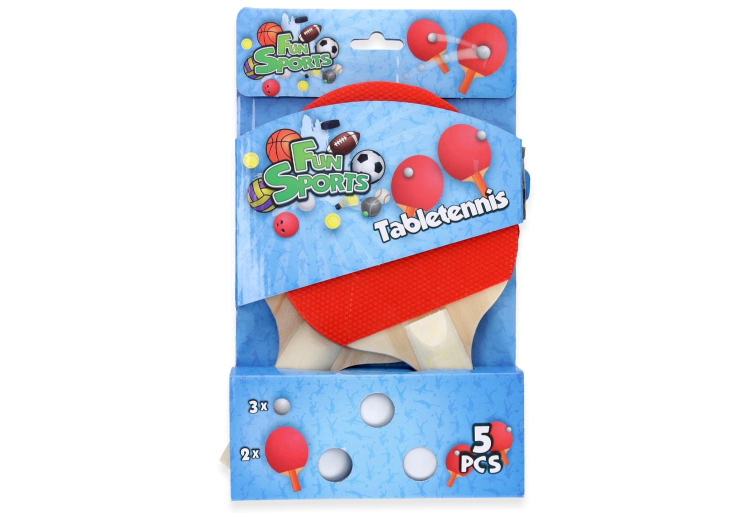 Deze set bestaat uit 2 houten batjes die zijn voorzien van een rubberlaag, plus 3 witte tafeltennisballetjes.