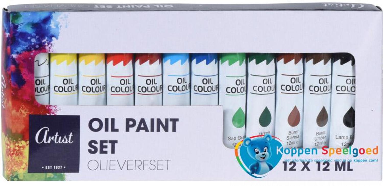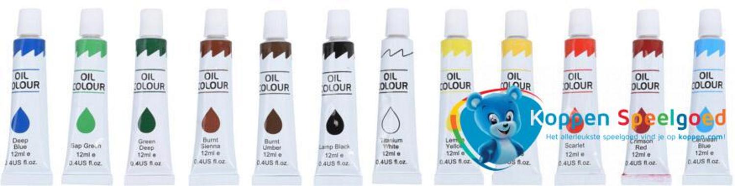 Doos met 12 tubes mooie kwaliteit olieverf in verschillende kleuren. Iedere tube bevat 12 ml verf.