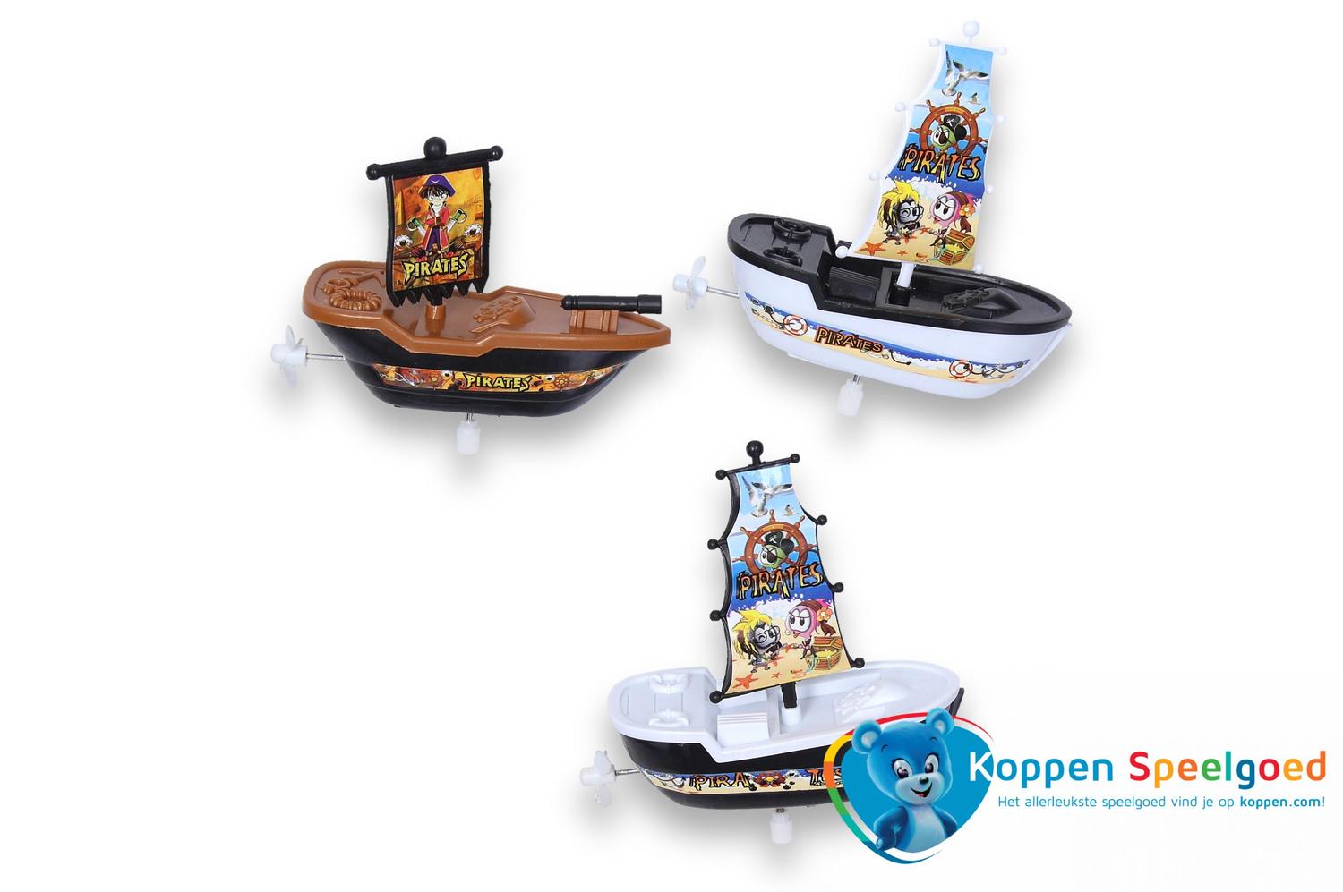 Opdraai piraten boot. Een klein bootje met opdraai functie. Laat het bootje door het water varen. Leuk voor de piraat vanaf drie jaar. De verschillende bootjes worden door elkaar geleverd.