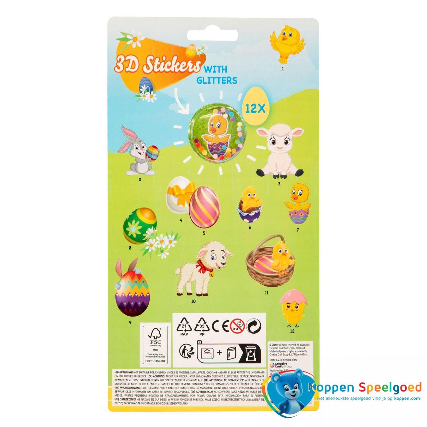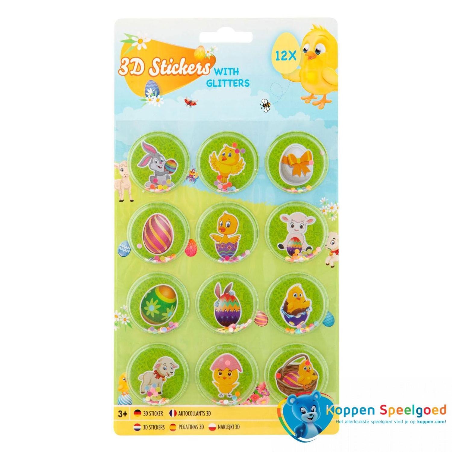 12 3D stickers in paasthema, met een transparante overkapping waar glitterconfetti in zit.