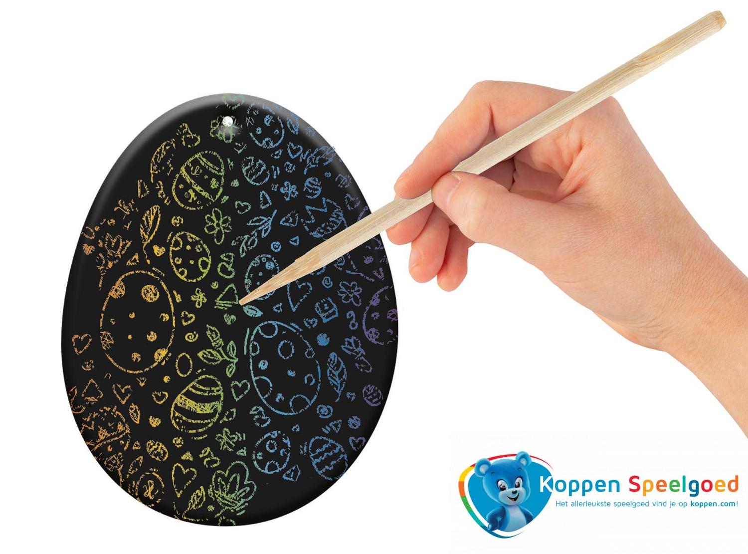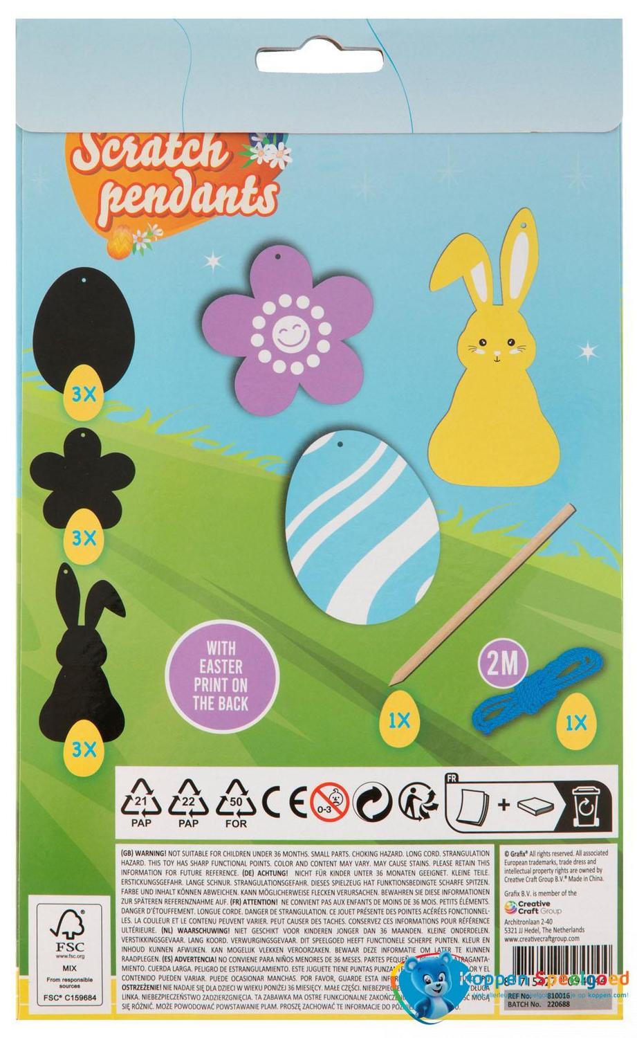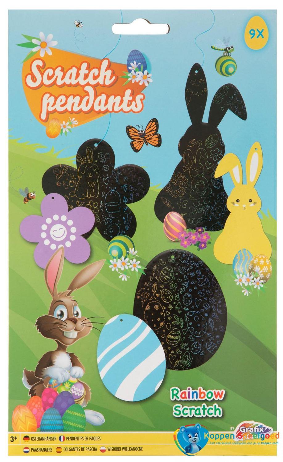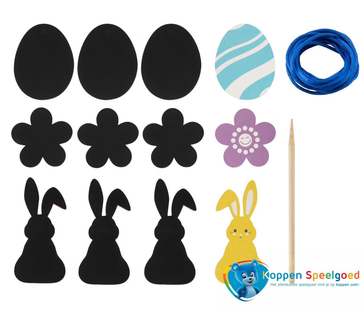 Set van 9 krasvellen die je kunt bekrassen met de meegeleverde kraspen. De krasvellen hebben de vorm van een bloem, ei of paashaas. De achterkant is voorzien van een print in paasthema. Je kunt ze ophangen als een hanger ter decoratie. Inclusief 2 meter ophangkoord.