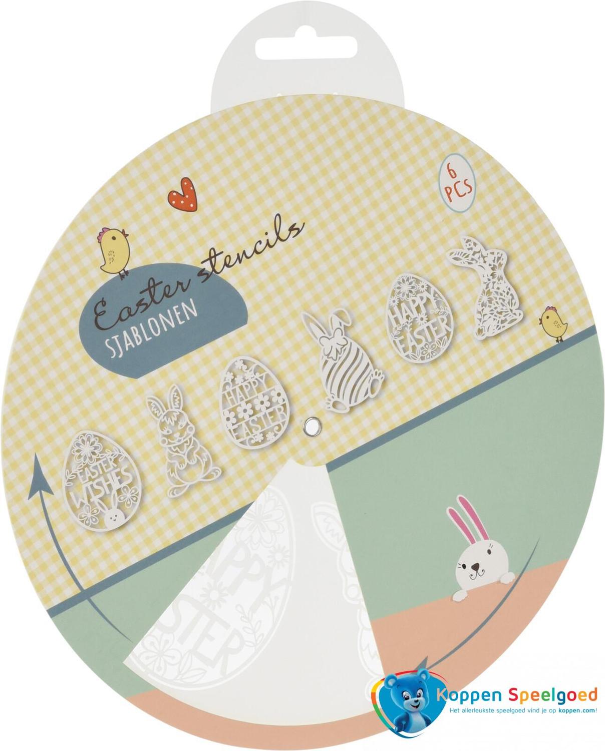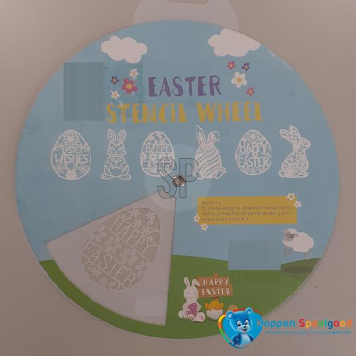 Draaischijf met 6 sjablonen in het thema van Pasen. Maak de mooiste paastekeningen met deze sjablonen. Dit sjabloon is te gebruiken in combinatie met kleurpotloden, verf of blaaspennen. Draai het papier over het stencil tot het gewenste sjabloon in de opening te zien is, en maak zo makkelijk een prachtig paasei of konijn!