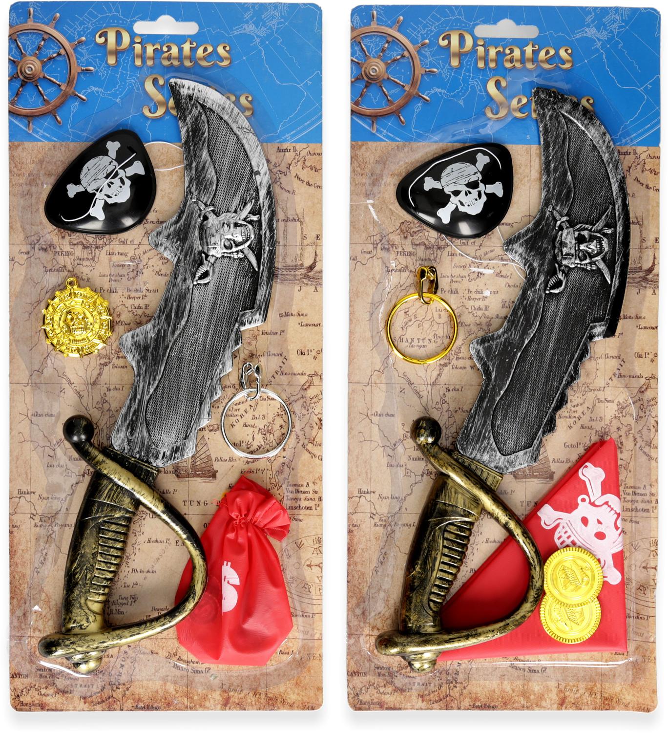 Piratenset op kaart met zwaard, ooglapje, oorring, medaillon en geldbuidel met munten of bandana met munten (dit verschilt per kaart).