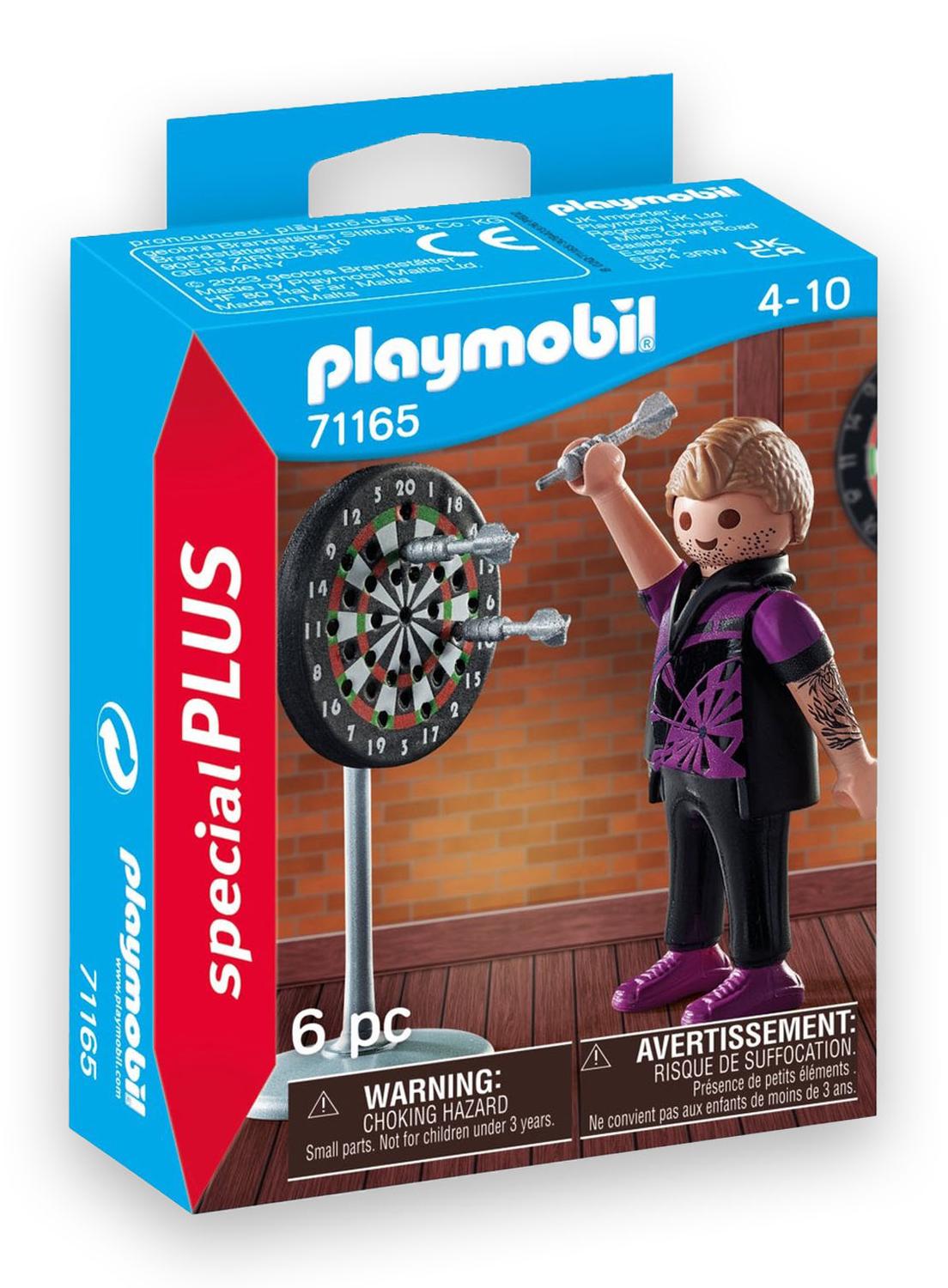 Darts is niet alleen een populair tijdverdrijf in de kroeg, maar ook een veeleisende sport. De dartspeler traint dagelijks om zijn behendigheid en concentratie te verbeteren. Hij gooit vakkundig de darts naar het dartbord. Alles raak, perfecte score! Inhoud Een Playmobil-figuur Een dartbord Drie darts. Kenmerken De darts kunnen in de hand van de figuur worden gehouden en op 31 verschillende posities op het dartbord worden bevestigd. Playmobil Special Plus-figuren bieden veel speelplezier met tal van accessoires voor kinderen vanaf 4 jaar. Met de speelgoedfiguren kan afzonderlijk of in combinatie met andere Playmobil-themawerelden worden gespeeld.