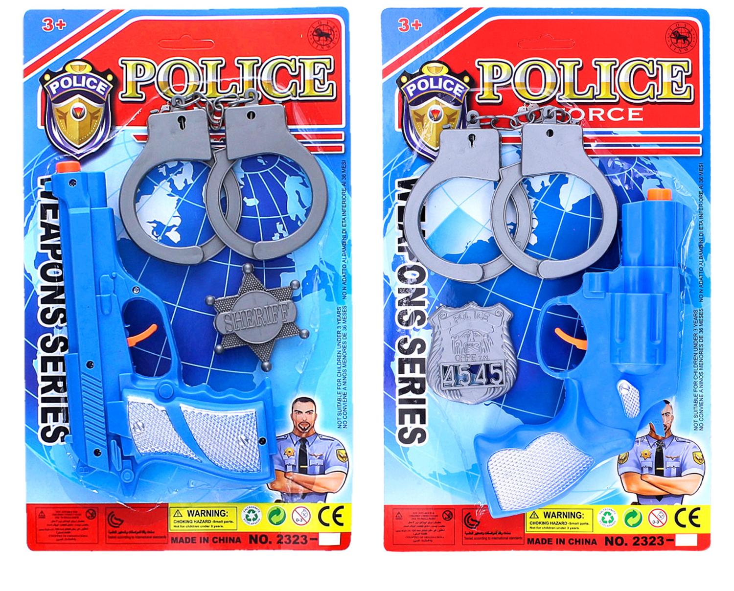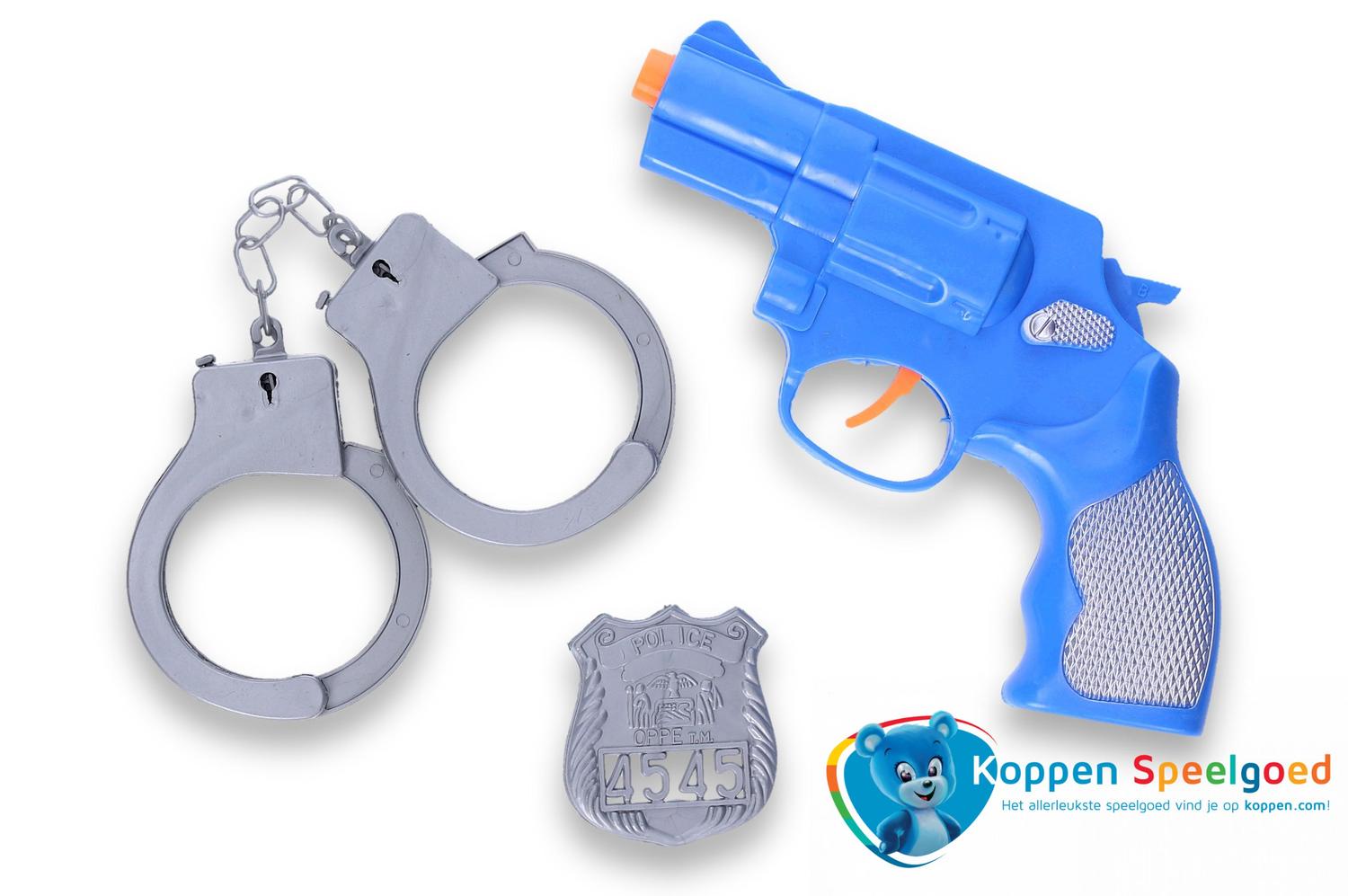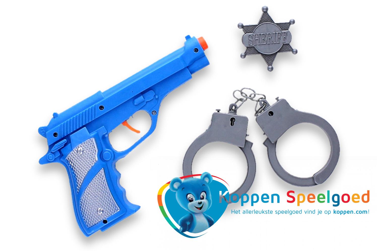 Politieset. De set bevat een pistool en handboeien. Daarnaast bevat het een sheriff set of een politiebadge.