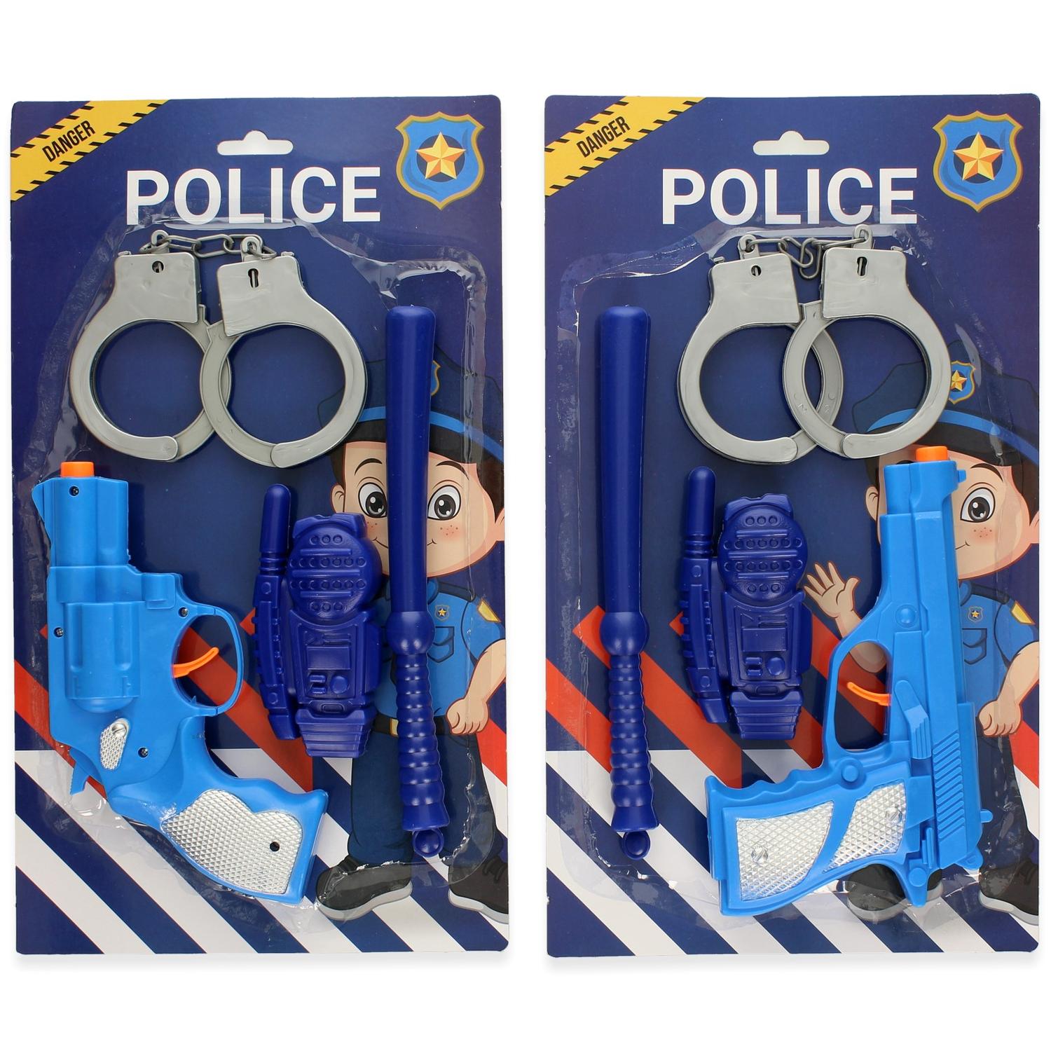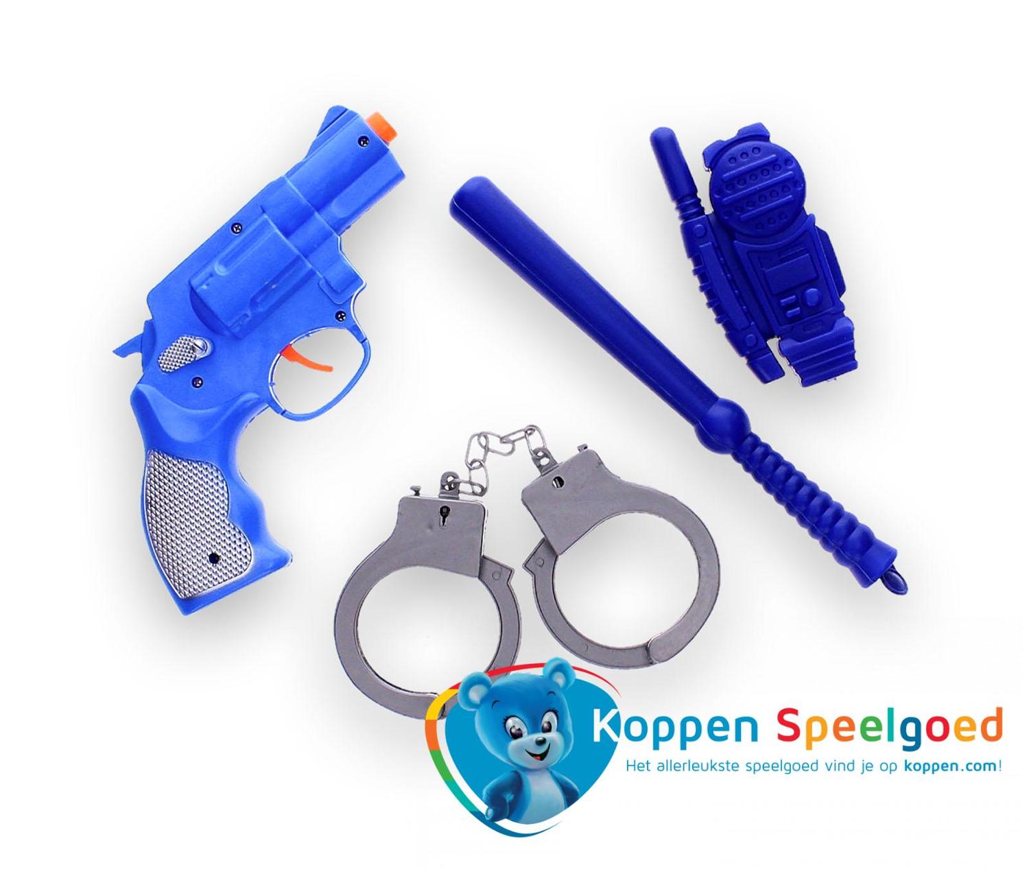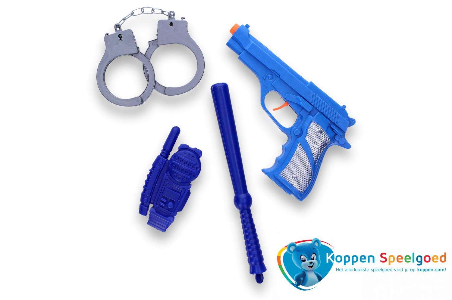 Politieset op kaart. Op deze kaart zit een pistool, walkie talkie, knuppel en handboeien. Weet jij de boeven in te slaan? Geschikt voor kinderen vanaf drie jaar. Ook leuk om als politie te verkleden voor een feestje of voor tijdens carnaval.