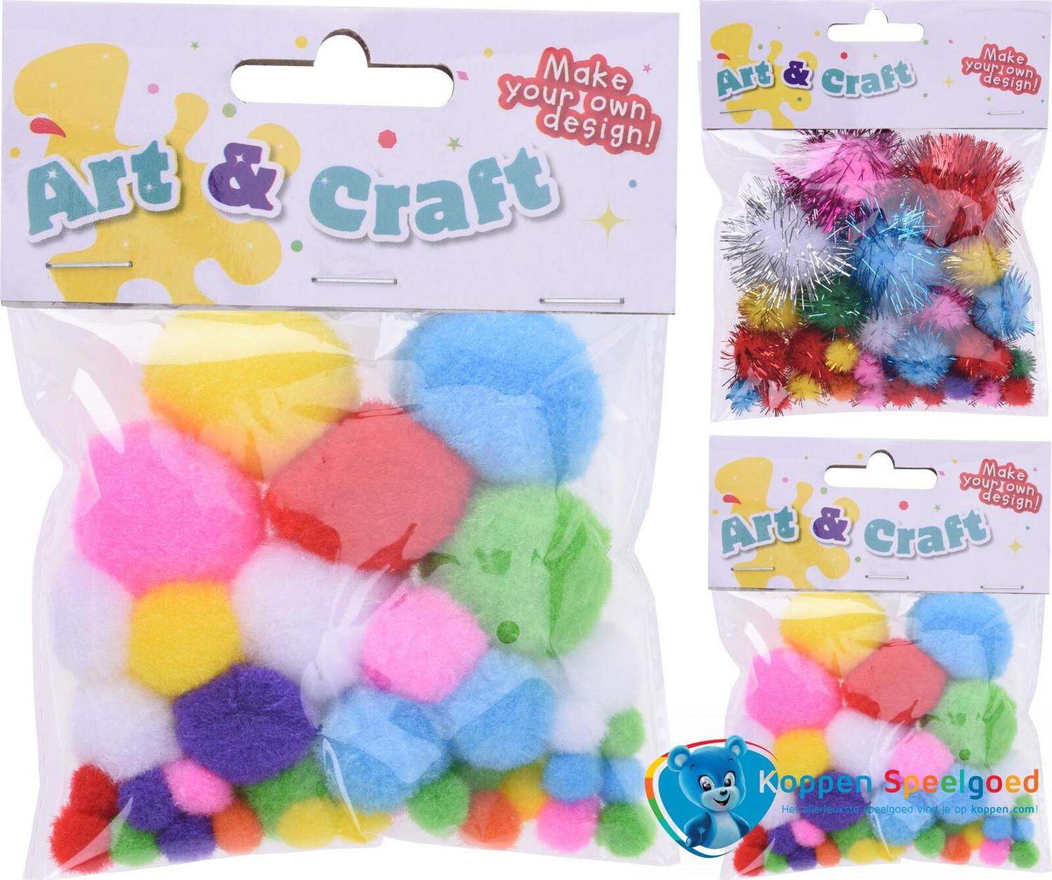 Prachtige pompons in bonte kleuren of met glitters. Leuk om mee te knutselen en dingen mee te versieren. Ieder zakje bevat pompons van 1, 2 en 4 cm doorsnede.