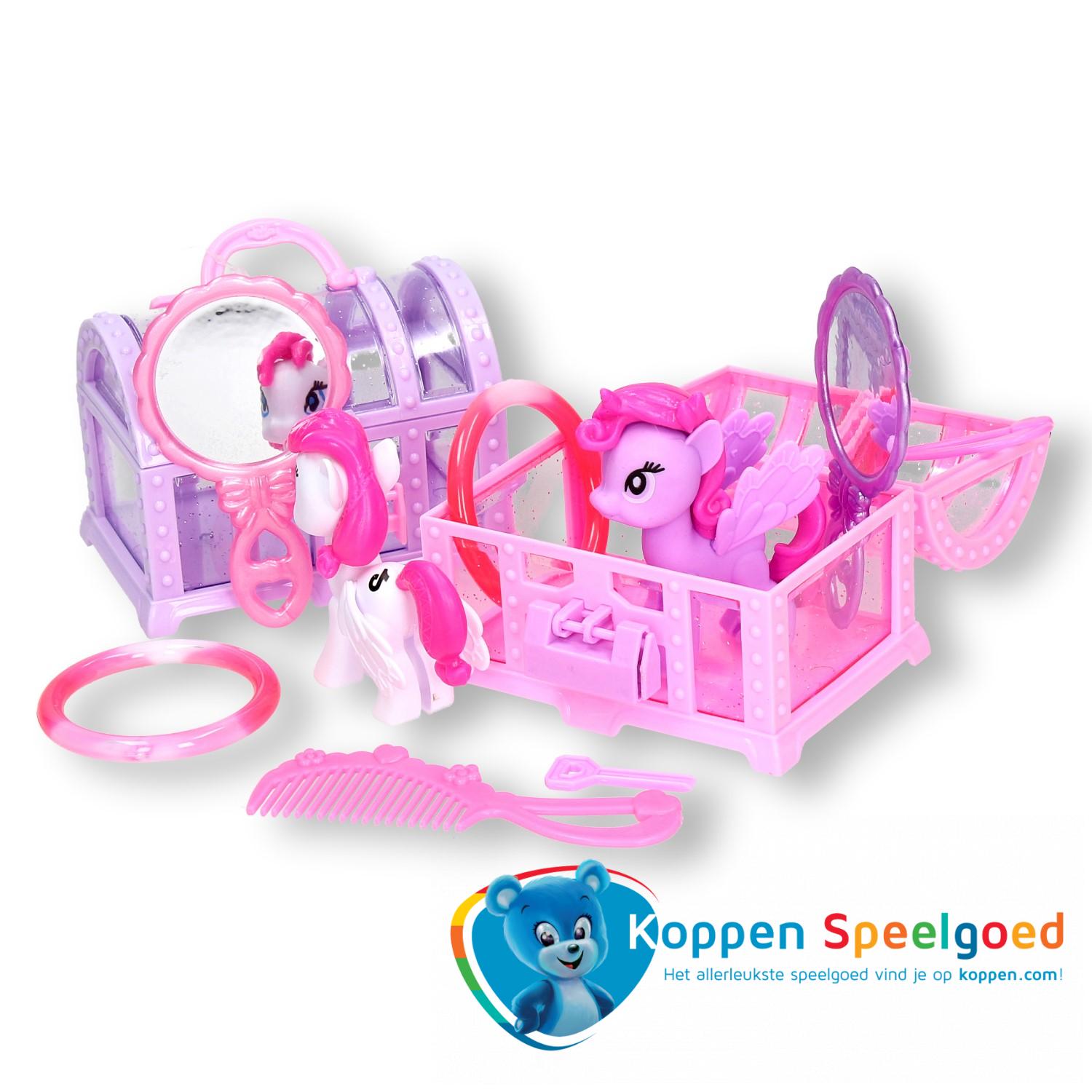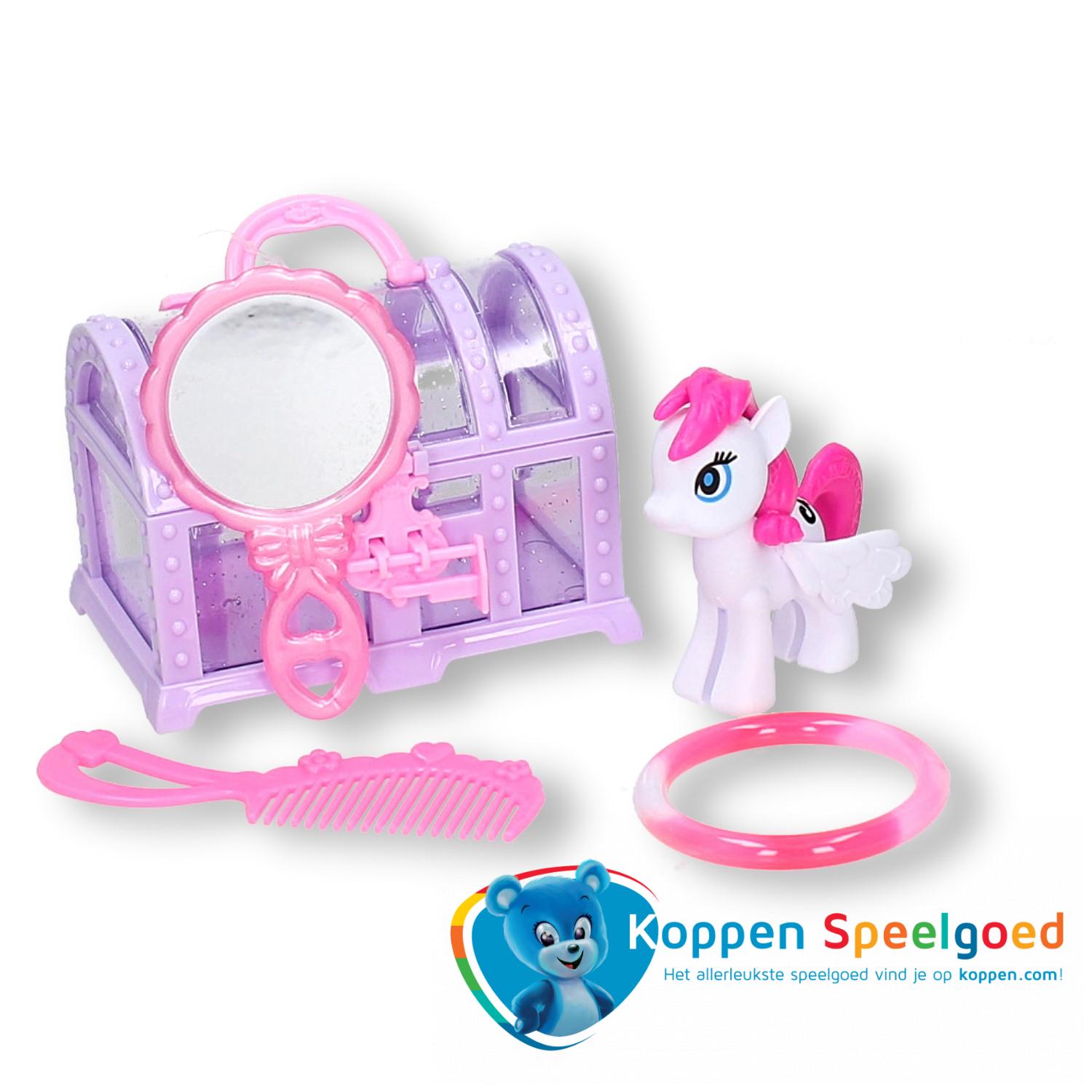 Pony in koffer met accessoires. Een pony in een opbergkistje. Er zitten tevens accessoires in het kistje. Af te sluiten met slotje. Geschikt voor kinderen vanaf drie jaar. De verschillende kleuren worden door elkaar geleverd.