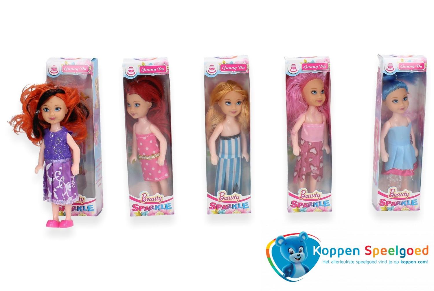 Pop met gekleurd haar. Er zijn verschillende poppen die door elkaar worden geleverd. De prijs is per stuk. Iedere pop heeft een andere jurk aan en andere kleur haren.
