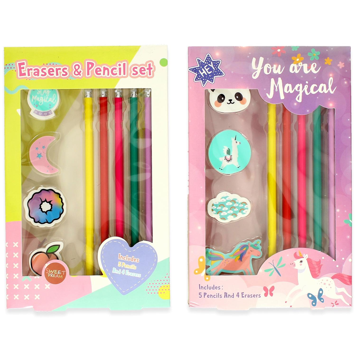 Deze vrolijke set met 5 potloden en 4 gummen in speelse vormpjes is ideaal voor school, knutselmomenten of thuis aan de tekentafel. De gummen zijn niet alleen handig, maar ook leuk om te zien. Perfect als cadeautje of om je eigen etui op te vrolijken!