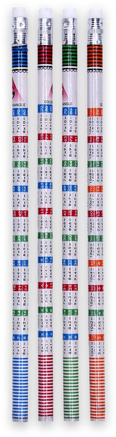 Dit is een bijzonder potlood: alle tafels van 2 tot en met 10 staan er als tabel op! Dat is handig! Bovenop het potlood zit een gum.