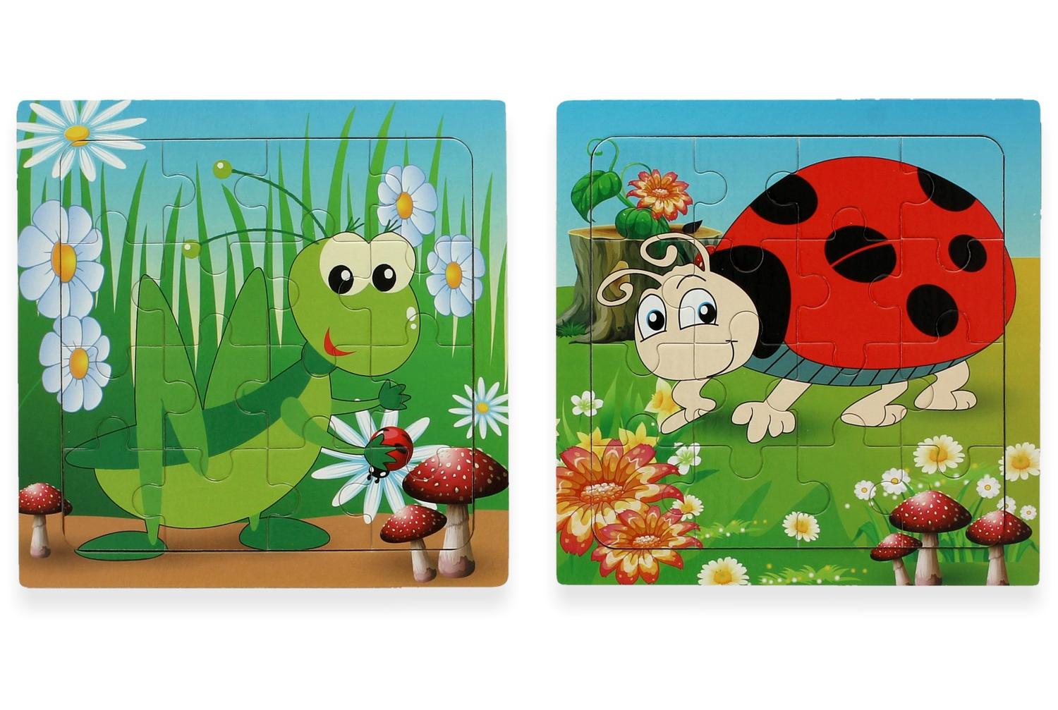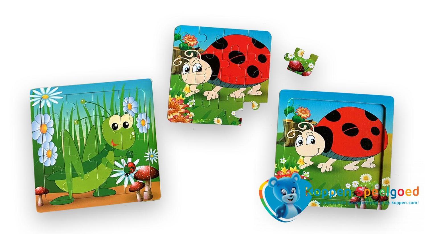 Puzzel sprinkhaan of lieveheersbeestje, hout. Een houten puzzel met daarom een print van een sprinkhaan of een lieveheersbeestje. Deze worden door elkaar geleverd. Iedere puzzel heeft zestien stukjes. Onder de categorie puzzels staan meer vergelijkbare producten.
