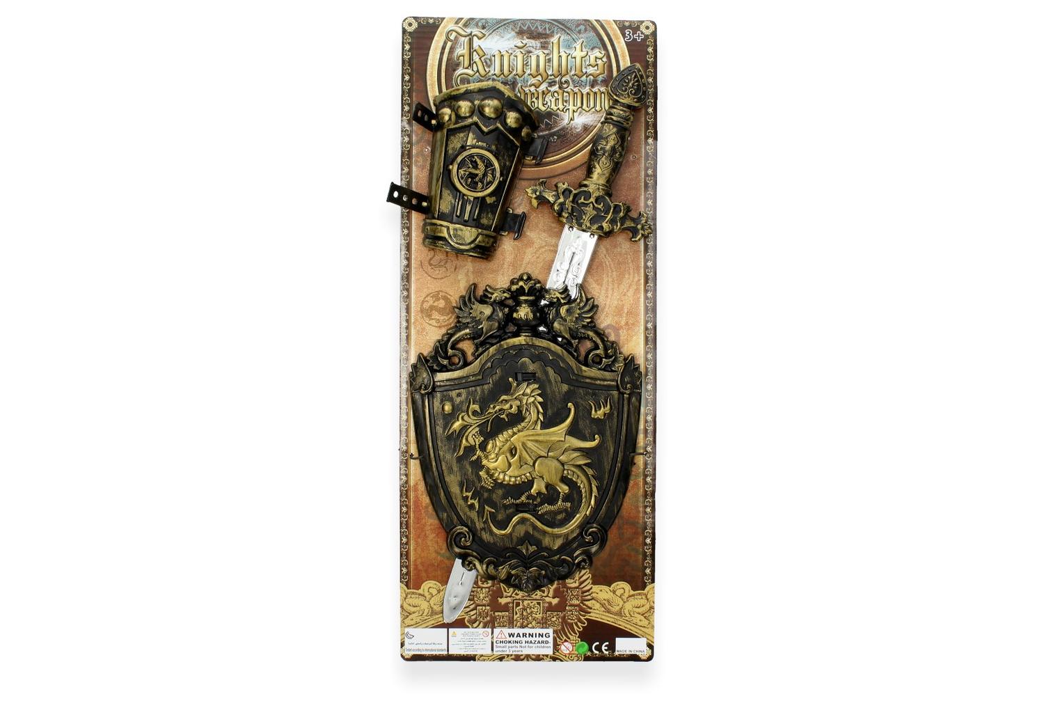 Een ridderset op een kaart voor de echte ridder. Bevat een zwaard, schild en band om een ridder outfit echt compleet te maken. Ook leuk om te verkleden tijdens een feestje of met carnaval.