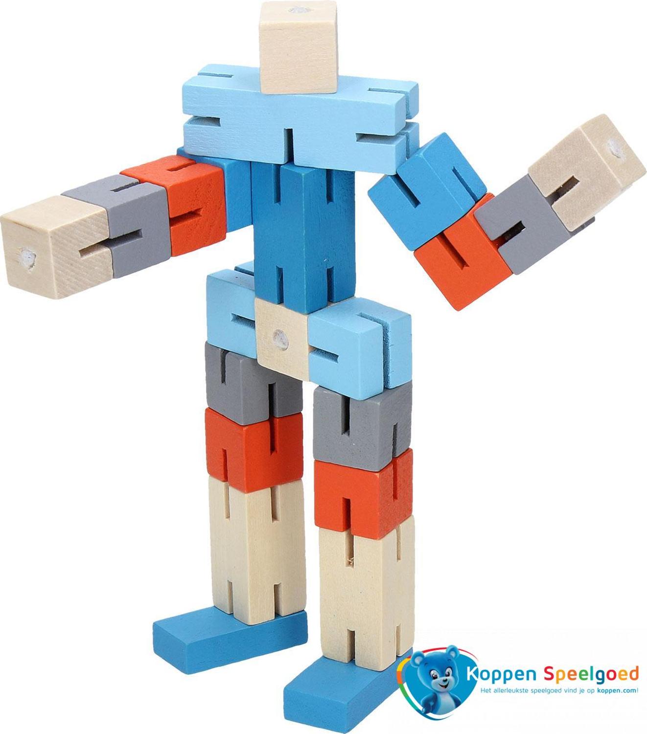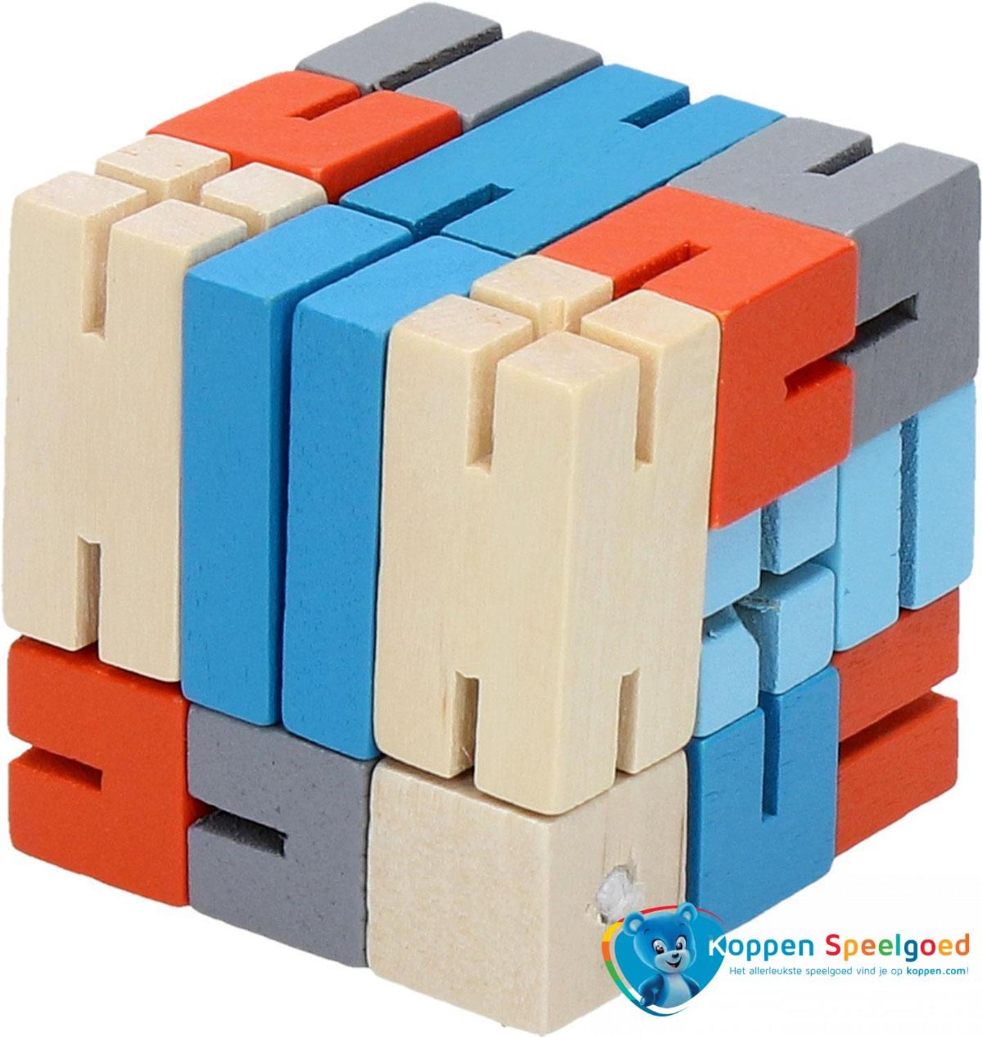 Puzzel in hout: kan jij het poppetje maken en het daarna weer tot een kubus inklappen? De oplossing zit erbij.