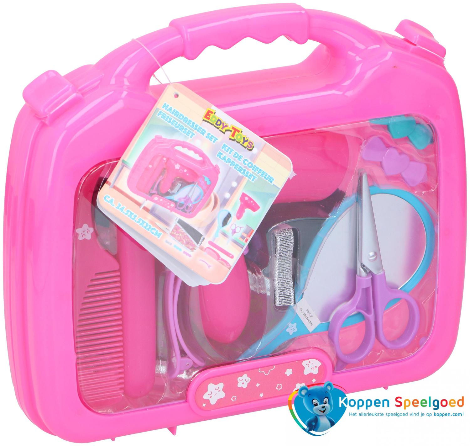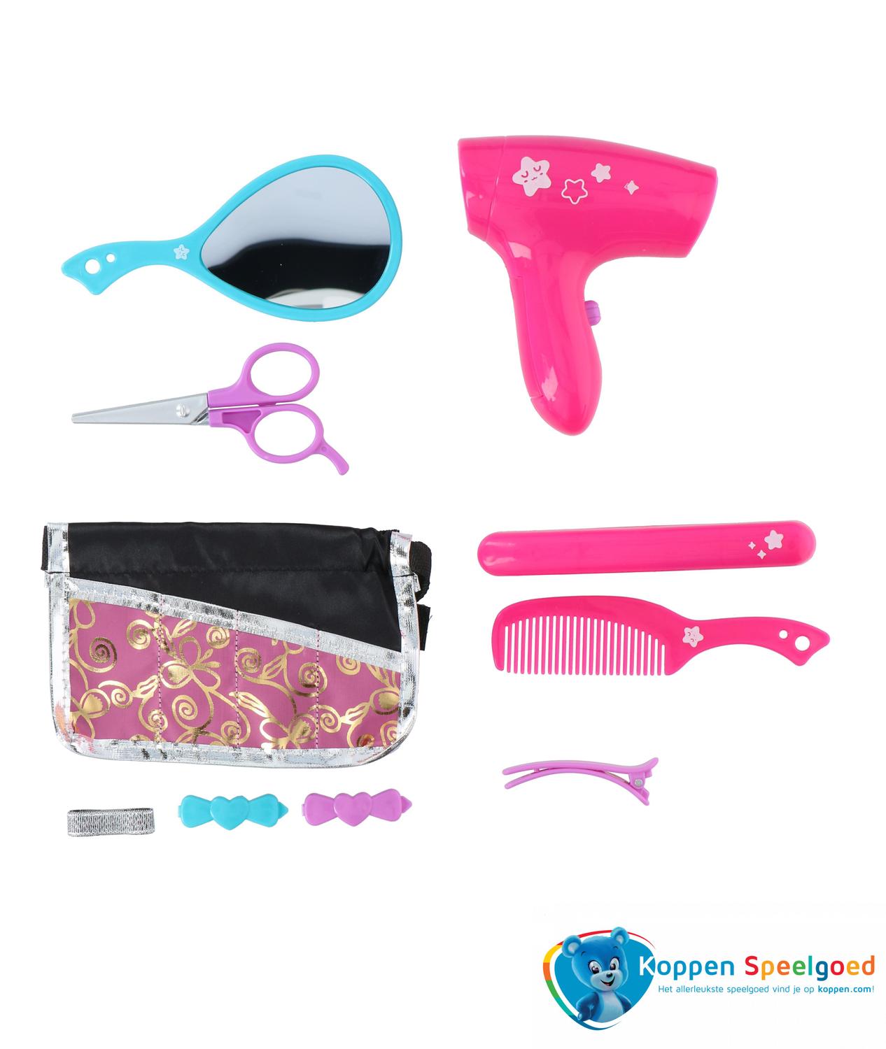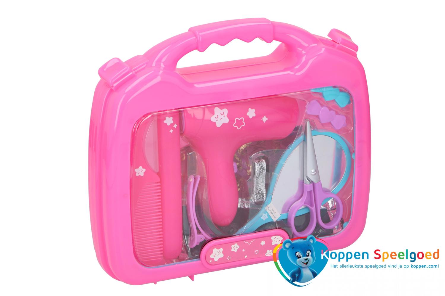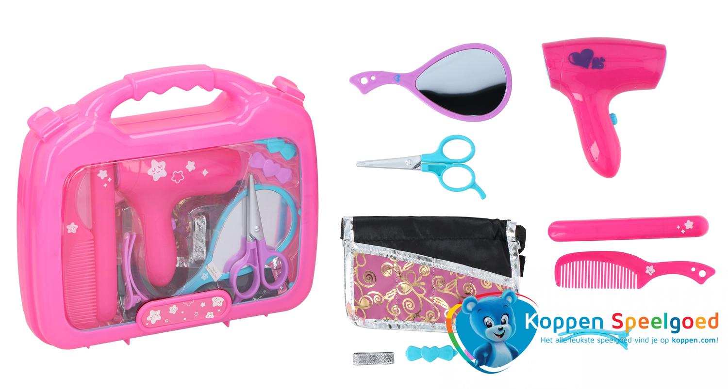 In dit mooie roze koffertje zit alles om kappertje te spelen. Waan je een echte haarstylist met al deze spulletjes. Experimenteer op je poppen, op je vriendjes en vriendinnetjes en wellicht willen je ouders ook model zitten.