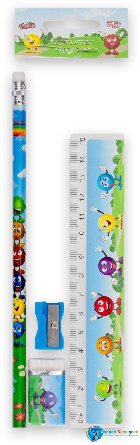 Schrijfset smile bestaande uit een puntenslijper, een gum, potlood en een liniaal van 15 cm.