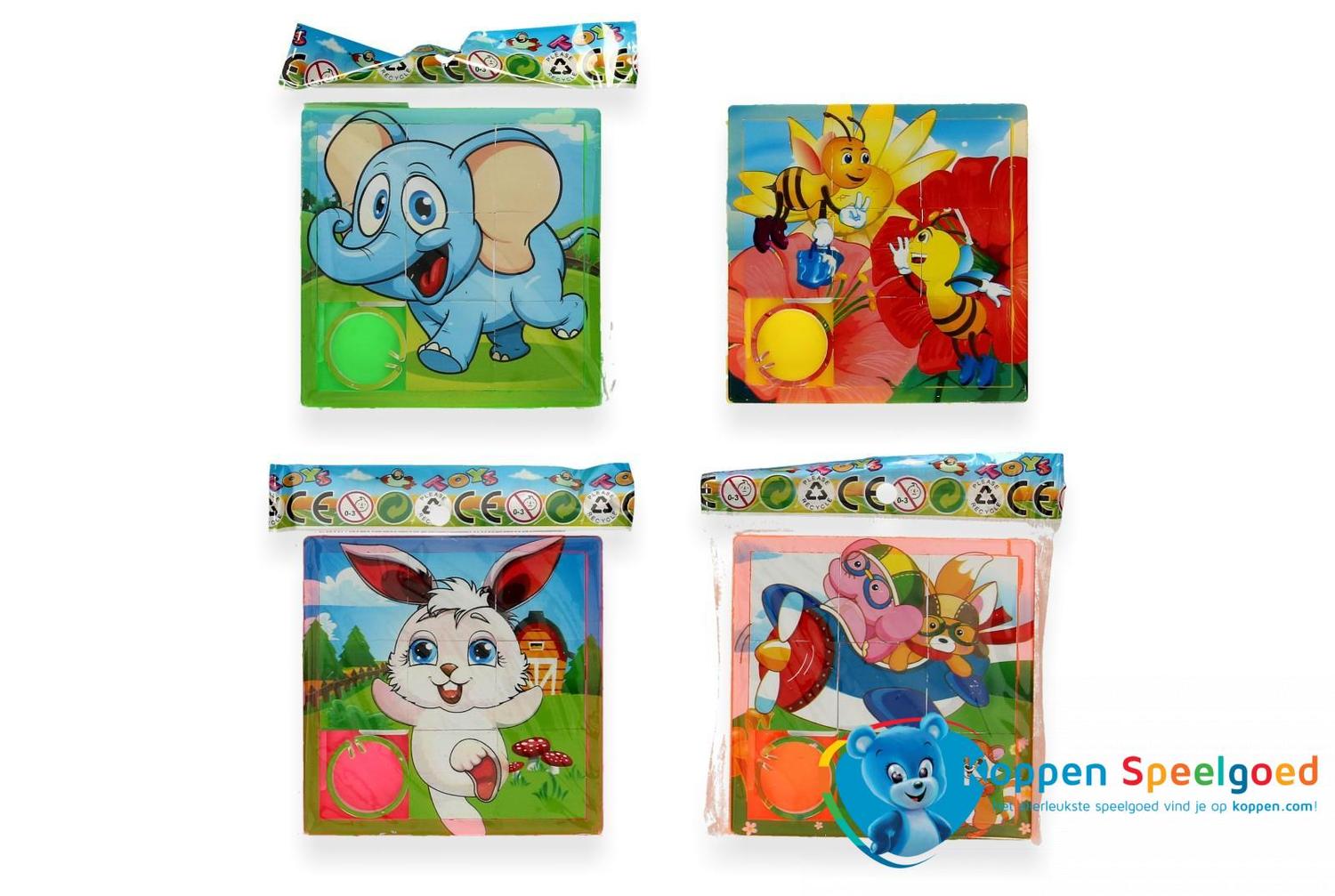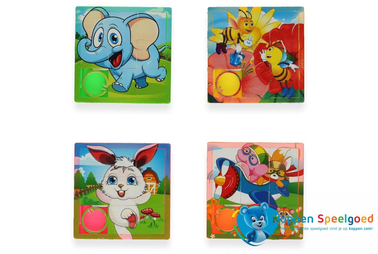 Schuifpuzzel. Schuif de stukjes rond totdat ze op de juiste plaats liggen en de puzzel compleet is. Geschikt voor kinderen vanaf drie jaar. Er zijn verschillende puzzels en deze worden door elkaar geleverd. Leuk voor in de grabbelton of als weggeef cadeau. Prijs per stuk.