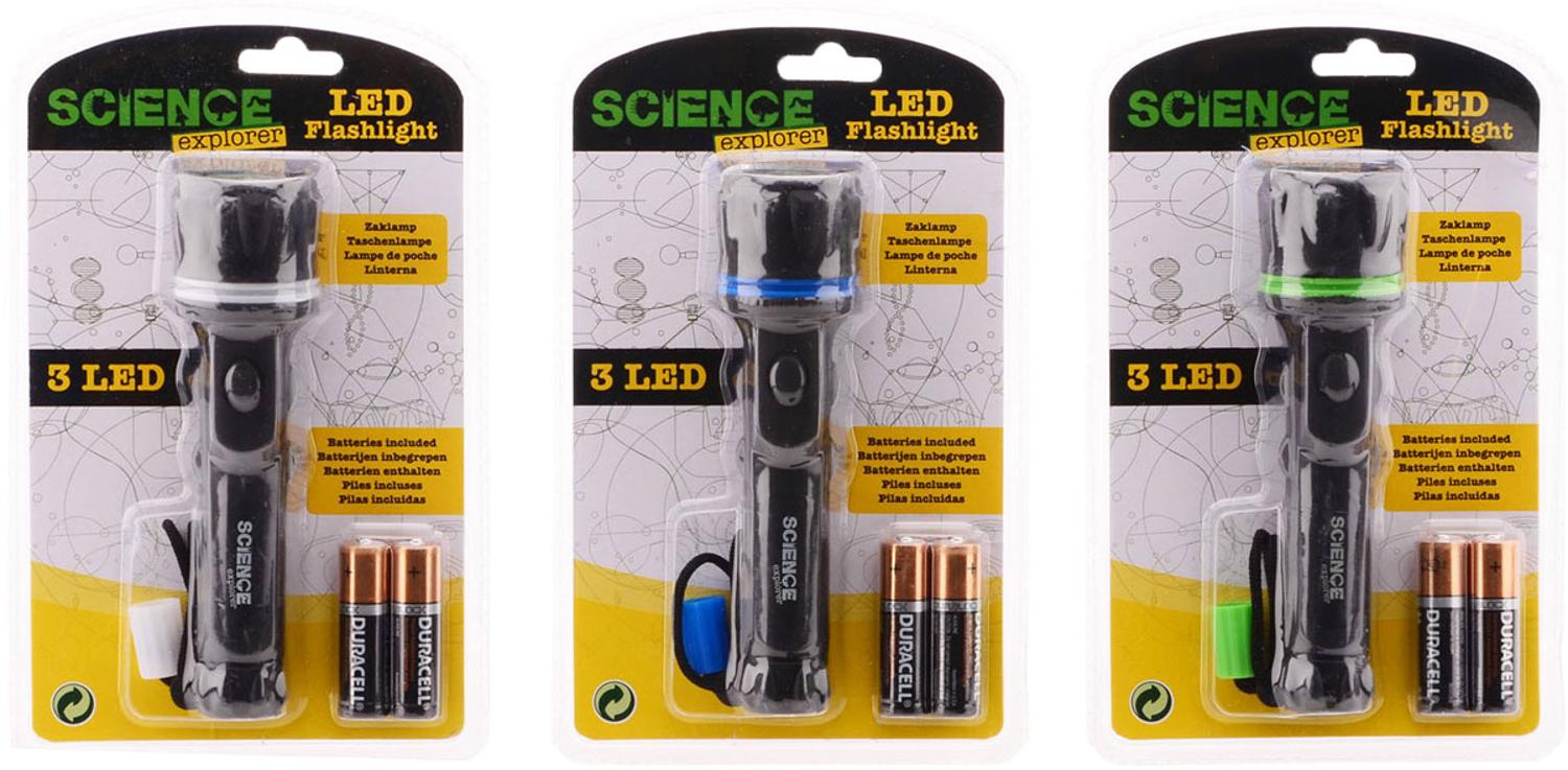 Science Explorer zaklamp op blister. De zaklamp wordt geleverd inclusief batterijen. Er zijn verschillende kleuren van de zaklamp en deze worden door elkaar geleverd. De prijs is per stuk.