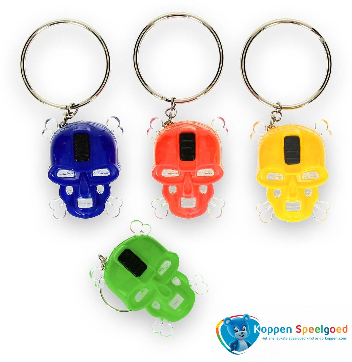 Sleutelhanger skelet met licht. Een sleutelhanger met skelet hoofd dat verschillende kleuren licht geeft. De verschillende kleuren schedel worden door elkaar geleverd. Geschikt voor kinderen vanaf drie jaar. Onder de categorie grabbelton staan meer sleutelhangers.