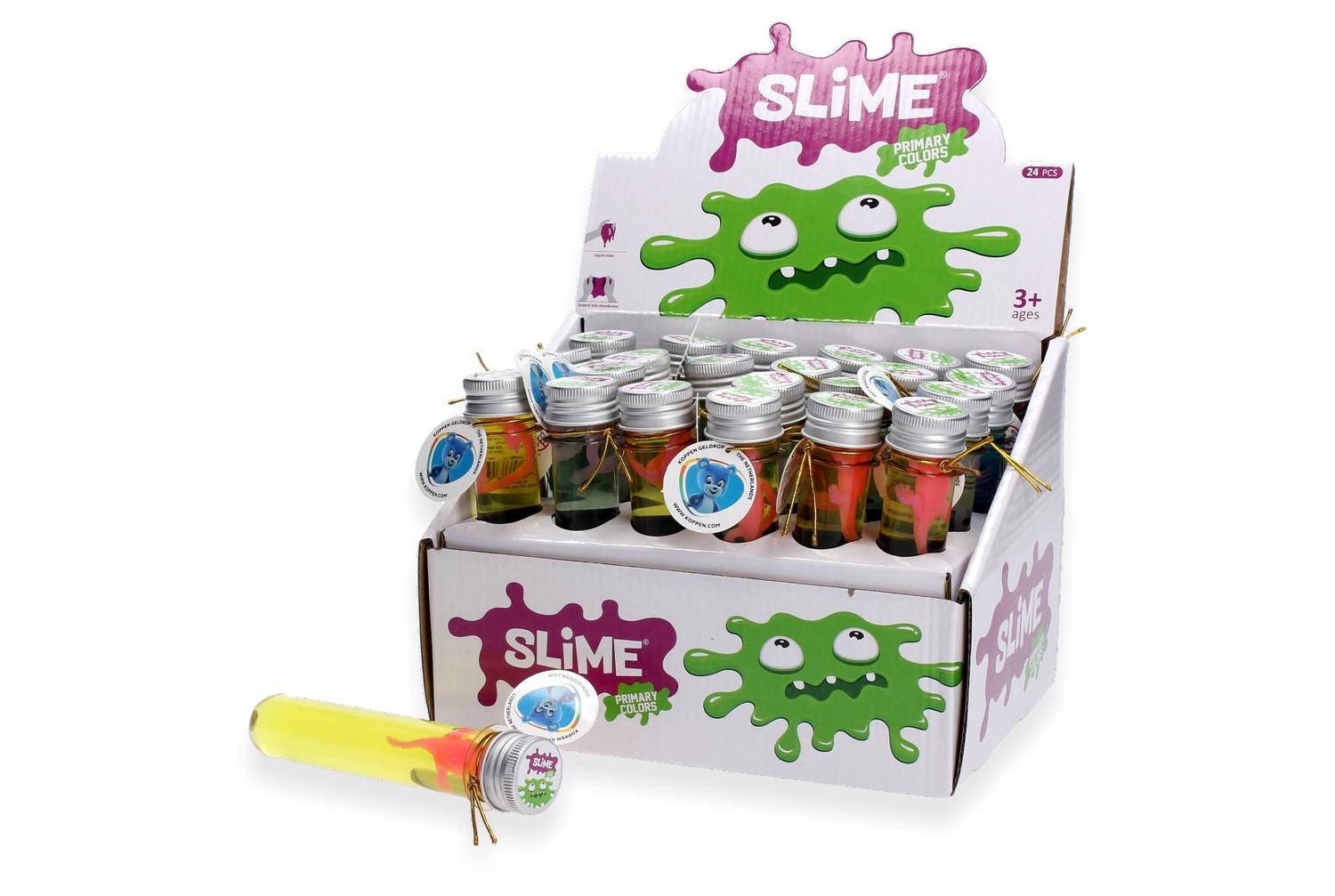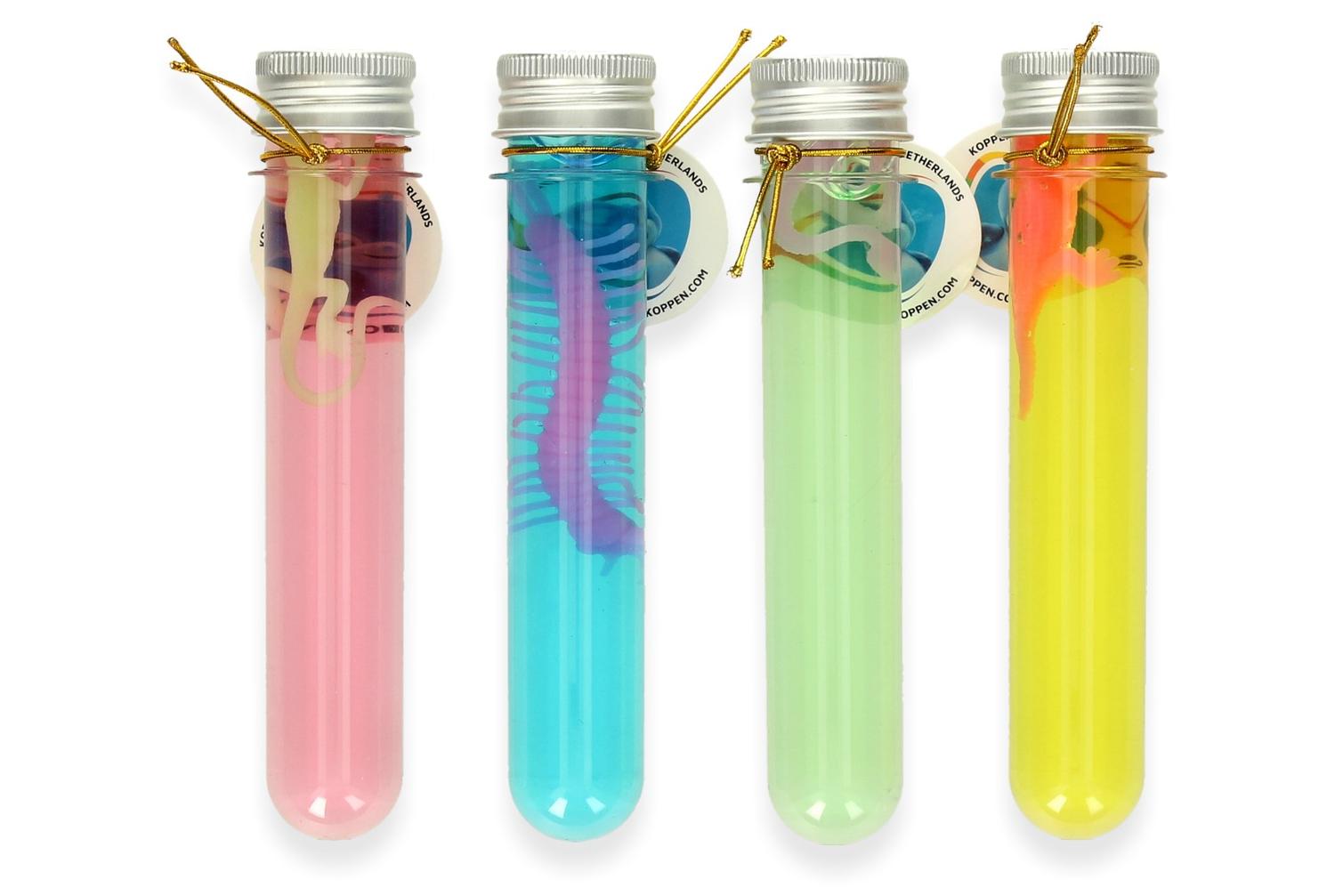Slijm met dier of insect in een buisje. Slijm in een reageerbuis. Haal het eruit, speel ermee en doe het terug in de buis. In het slijm zit ook nog een dier of insect. Geschikt voor kinderen vanaf drie jaar.