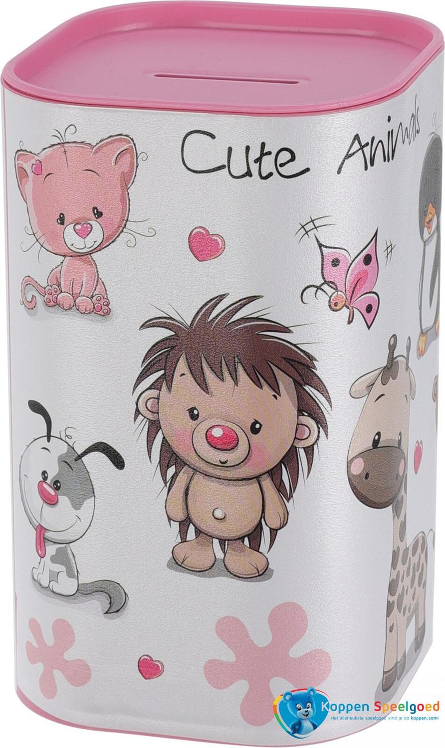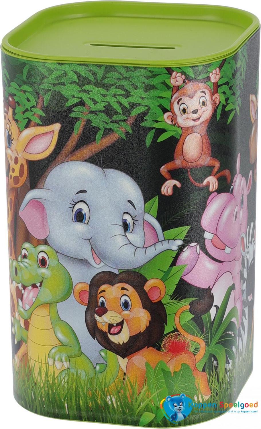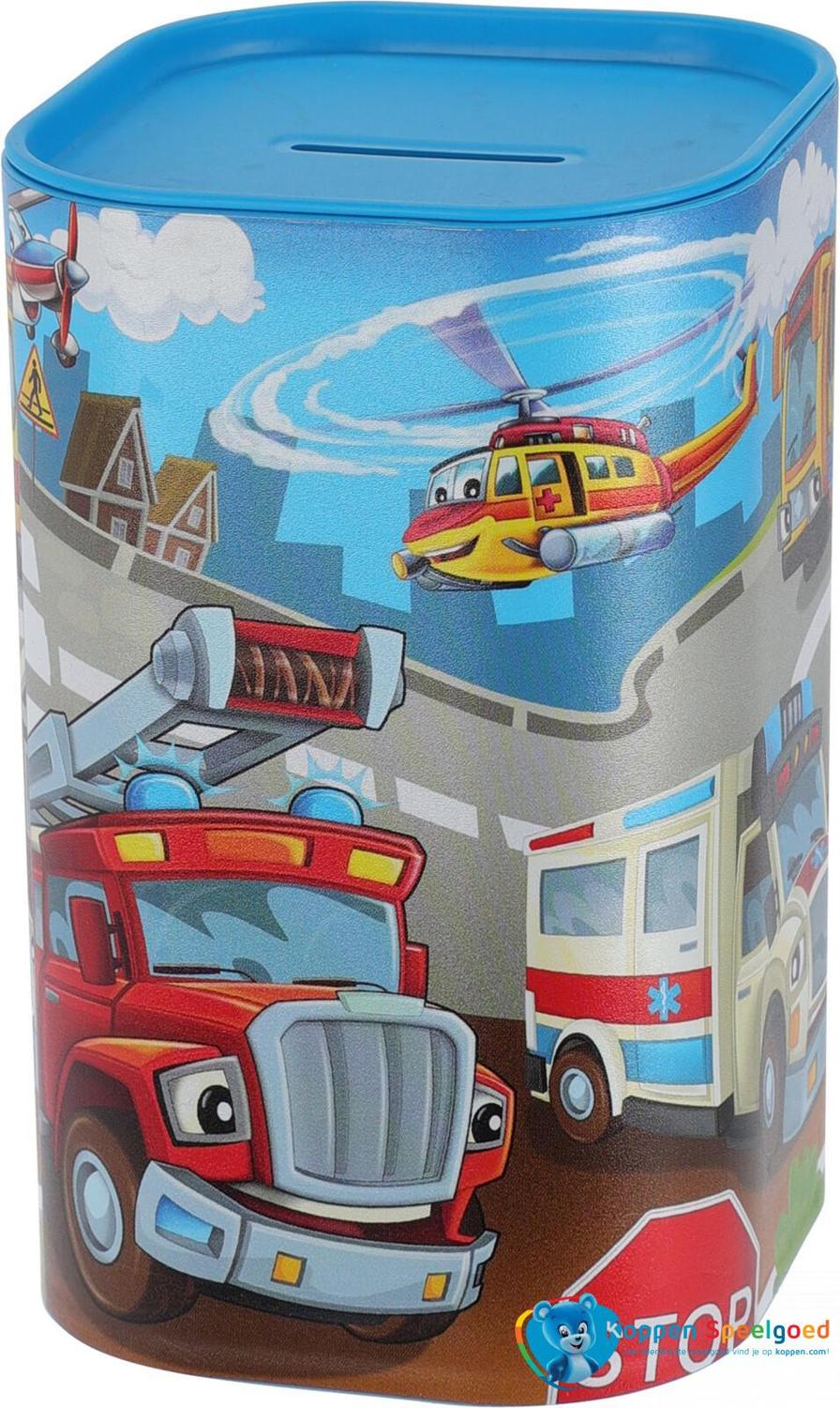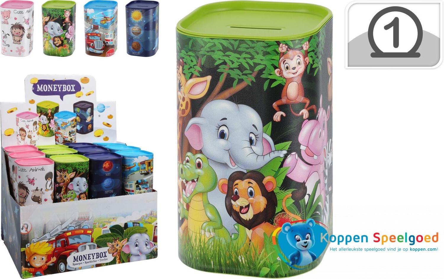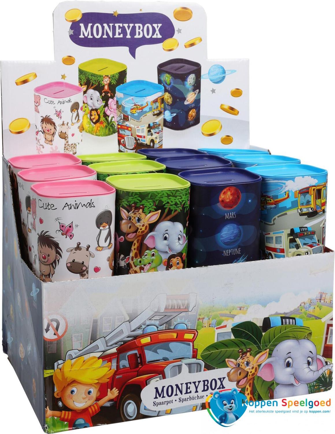 Vrolijke spaarpot voorzien van een leuke opdruk. Bovenop zit een deksel met een gleuf om geld in te kunnen werpen. De deksel kan van de bus af.