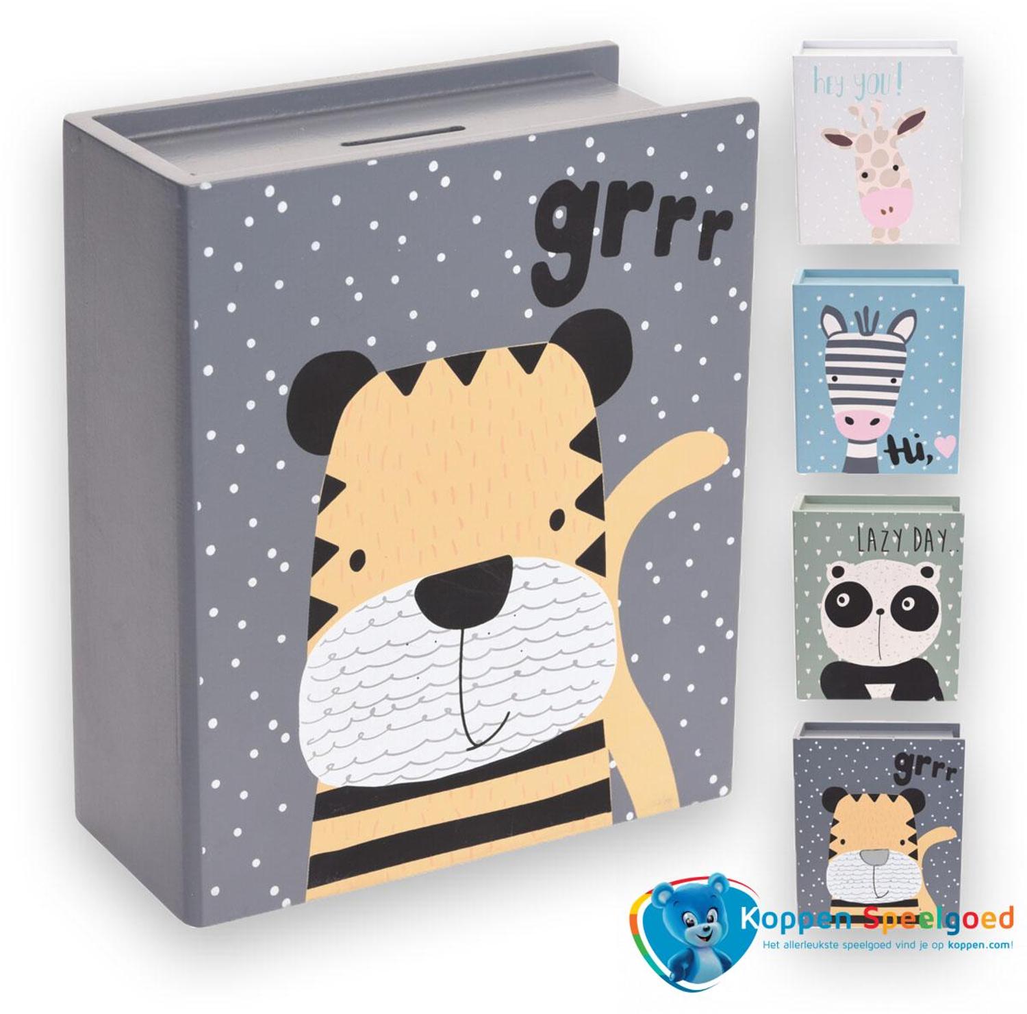 Deze spaarpot lijkt op een boek, en heeft een print van een leuk, wild dier.