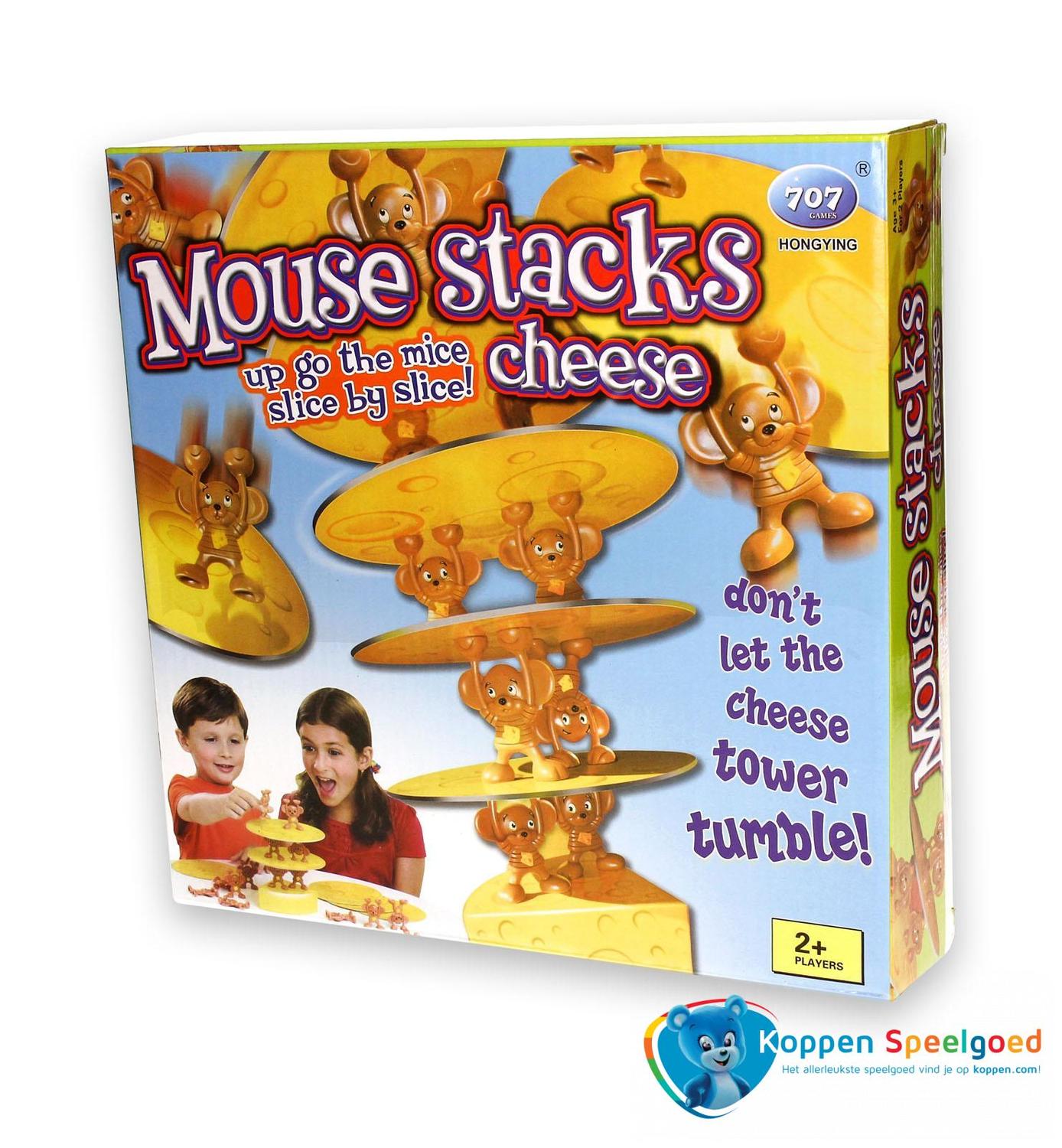 Spel kaastoren met muizen. Bouw een kaastoren door de muizen de kaasplakken te laten dragen. Een speler zet twee muizen op de kaastoren. De muizen helpen de kaasplak te balanceren met hun handen en voeten. Maak het moeilijker voor jouw tegenstander door de muizen in verschillende hoeken te plaatsen. Als de toren valt, heb je verloren. Geschikt voor kinderen vanaf drie jaar. Vanaf twee spelers.