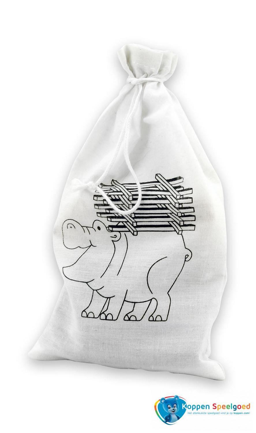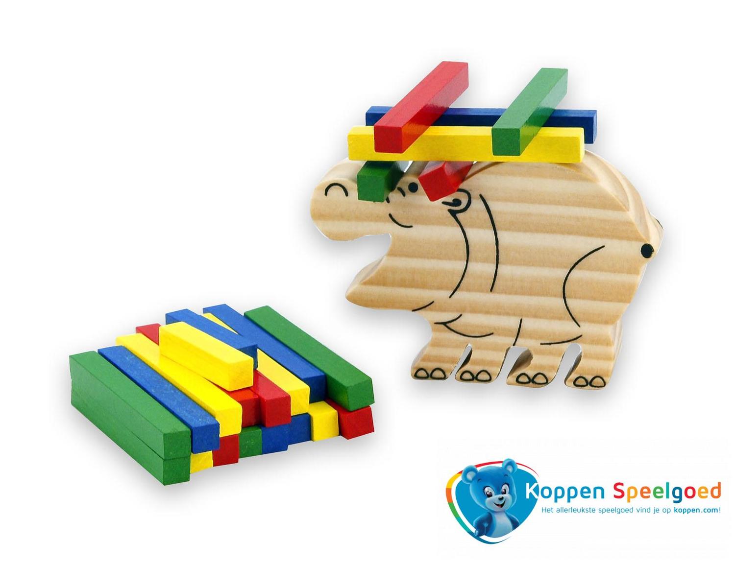 Stapel de staafjes op het nijlpaard. Speel tegen iemand anders en zorg dat je als eerste alle staafjes kwijt bent. Wordt geleverd in een zakje, zodat je het na het spelen weer makkelijk op kan bergen. Stapel nijlpaard in zakje, hout is geschikt voor kinderen vanaf drie jaar.