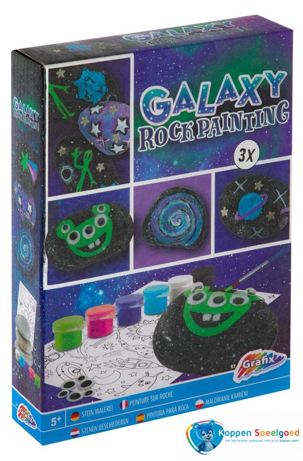 Beschilder de 3 meegeleverde stenen met Galaxy verf! Met wiebeloogjes, plaksterren, sjabloon transfers, 6 kleuren verf en kwast.