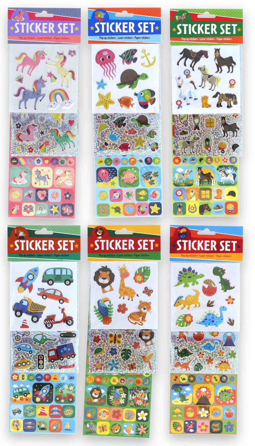 Verschillende leuke stickers in eenhoorn, dino, wilde dieren, zeedieren, paarden en voertuigenthema.