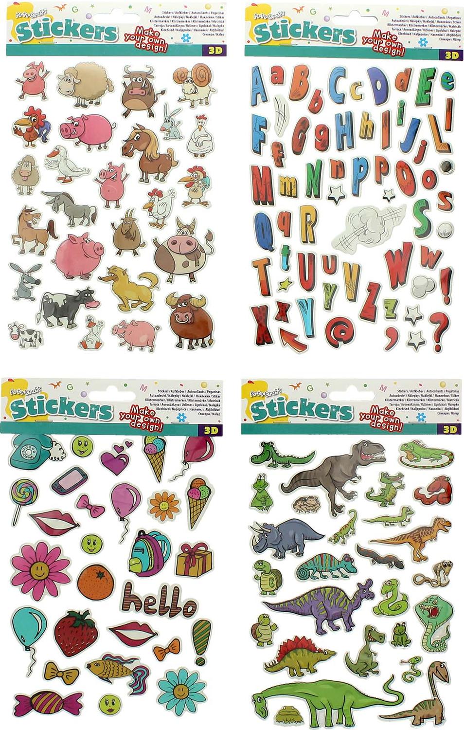 Deze stickers zijn speciaal: ze hebben een 3D-effect omdat ze dikker gemaakt zijn met foam. Boerderijdieren, dino's, letters van het alfabet en een vel met lente- en zomerdingen.