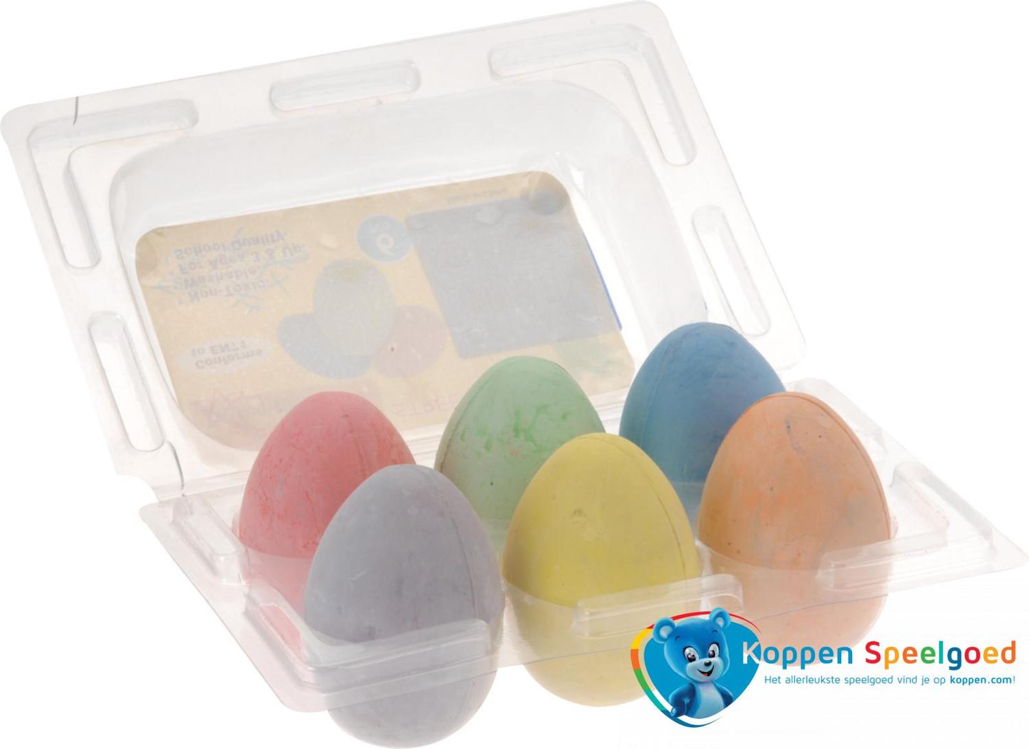 Zes eieren in een handig doosje. De eieren zijn stoepkrijt. In zes verschillende kleuren, om veel mee te tekenen!